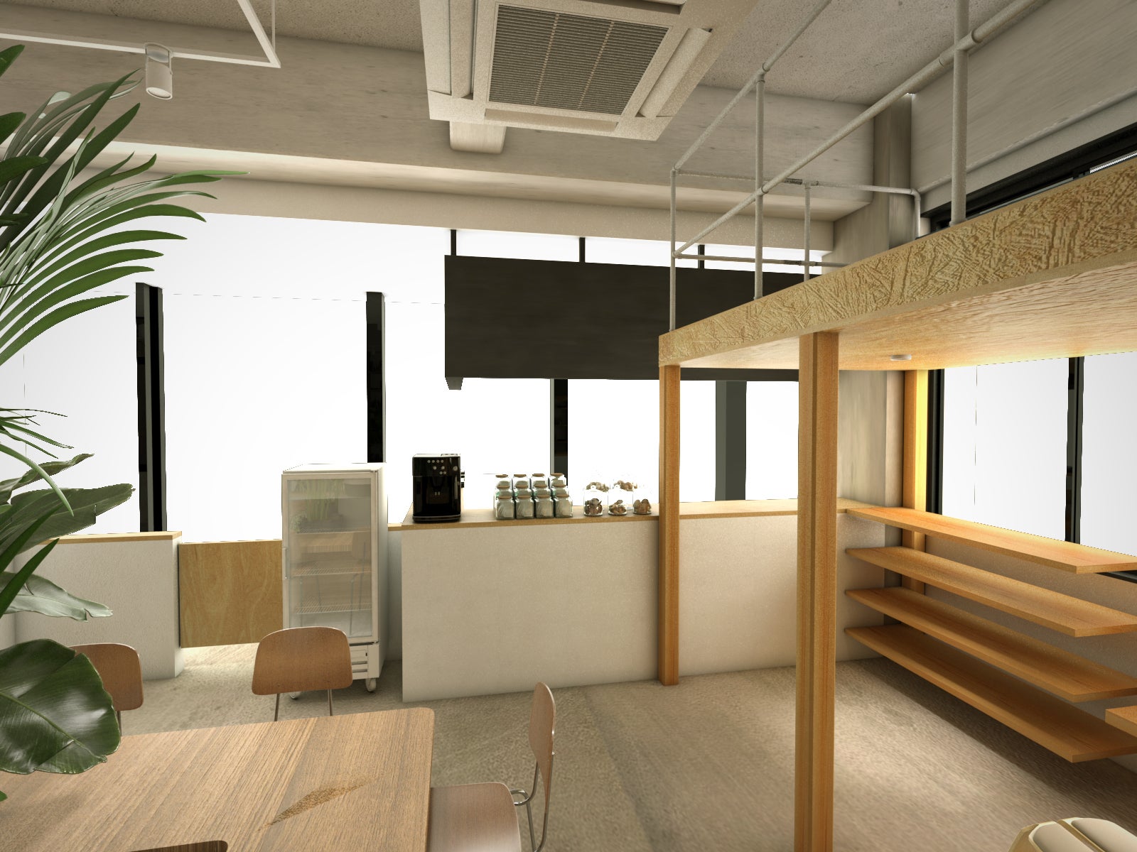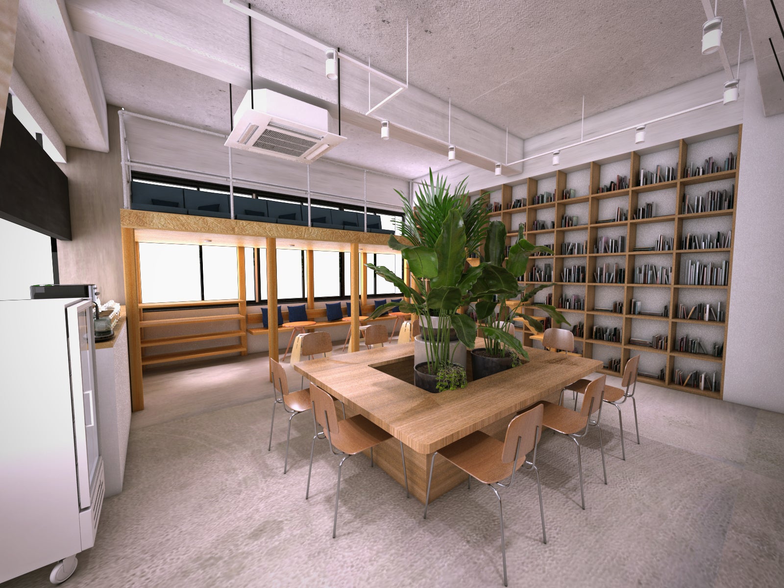 入場ゲートを通るとまず最初に目に入る位置にセンターテーブルを設置します。一般的なコワーキングスペースなどでは個別のテーブル・椅子のセットが複数おいてあることも多いのですが、コミュニケーションを重視した「みんなの」では、誰かが座っていればその気配を感じて、顔を上げれば目が合う仕組みづくりを目指しました。といっても、お互いの姿が丸見えなのも少し気を使ってしまうので、テーブルのセンターには目隠し程度に植物などを配置刷る予定です。