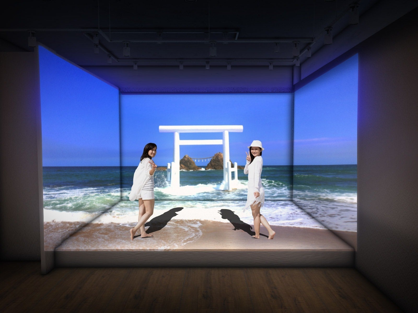 ドリンクバーと焼き菓子、本を片手にゆっくりとした時間を過ごせます。旅人はレンタサイクル前後に休憩しながら旅のコースを相談。4面プロジェクションマッピングで、糸島の風景をプロジェクションマッピングで立体的に投影。 マッピングの前で写メを撮ると、そこに立ってるみたいな疑似体験写メが撮れます。 旅人はレンタサイクル前にシミュレーション。休憩しながら旅のコースをシュミレーションできます。