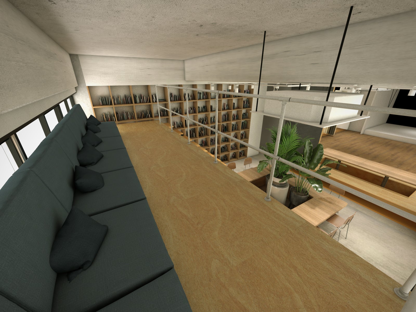 コワーキングスペースの端には、中二階スペースを用意。ちょっとだけ目線が外れて集中して本を読みたい方や、ソファに座ってゆっくり仕事がしたい方向け。独特な秘密基地感がありますので、子供にも人気のスペースになってしまうかもしれません。