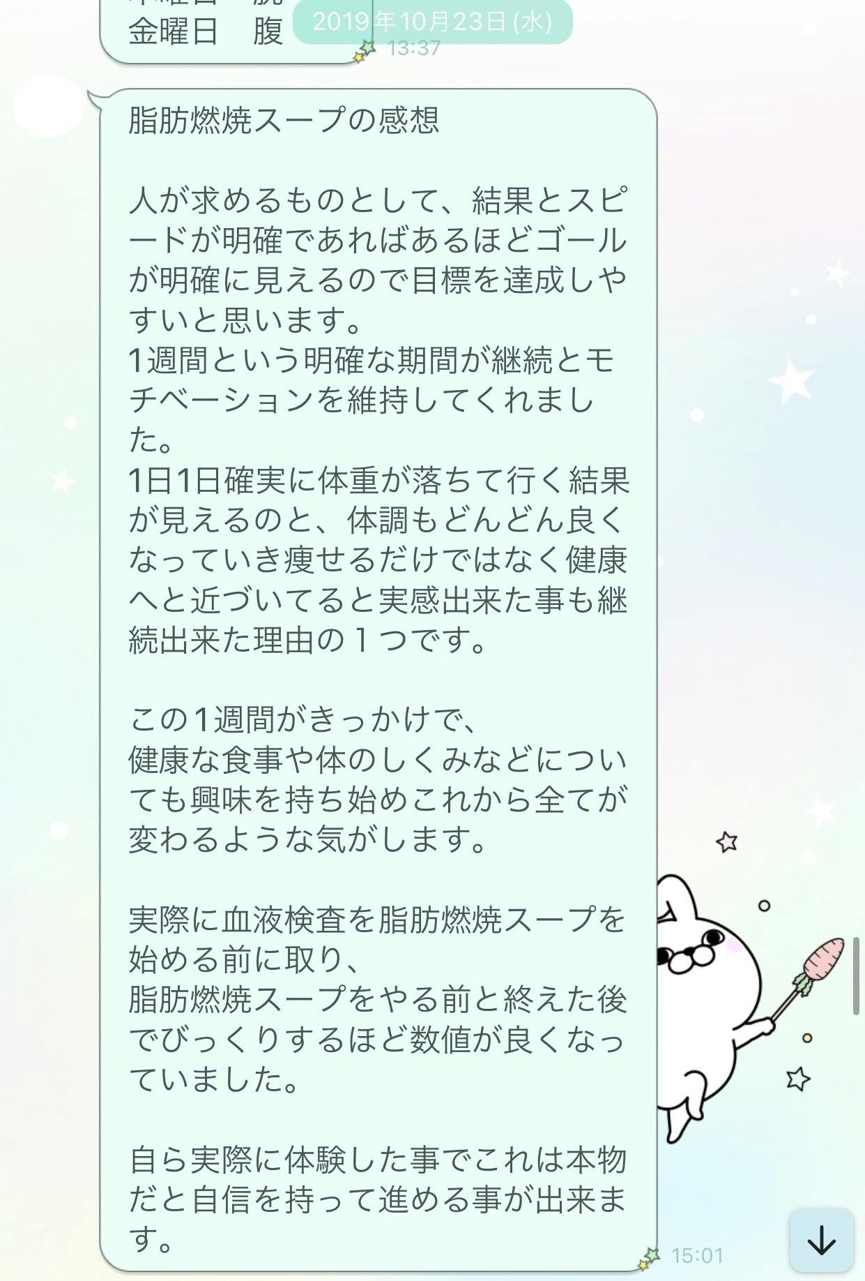 1日1日確実に体重が落ちてゆく結果が見えるのと、体調もどんどん良くなっていき、痩せるだけではなく健康へと近づいてると実感出来た事も継続出来た理由の1つです。