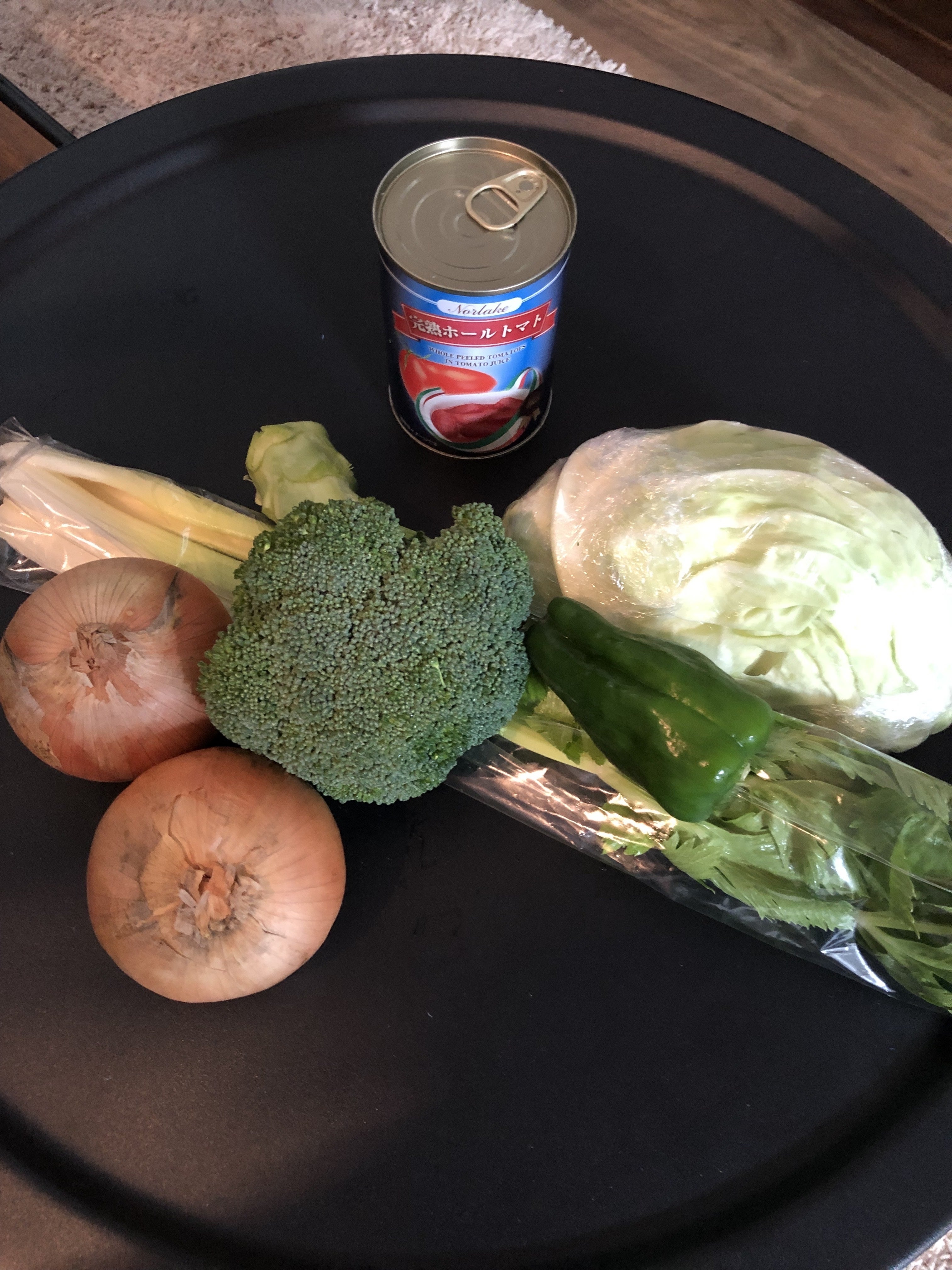 たまねぎ、キャベツ、セロリ、ピーマン、ブロッコリー、ホールトマト缶が含まれています。