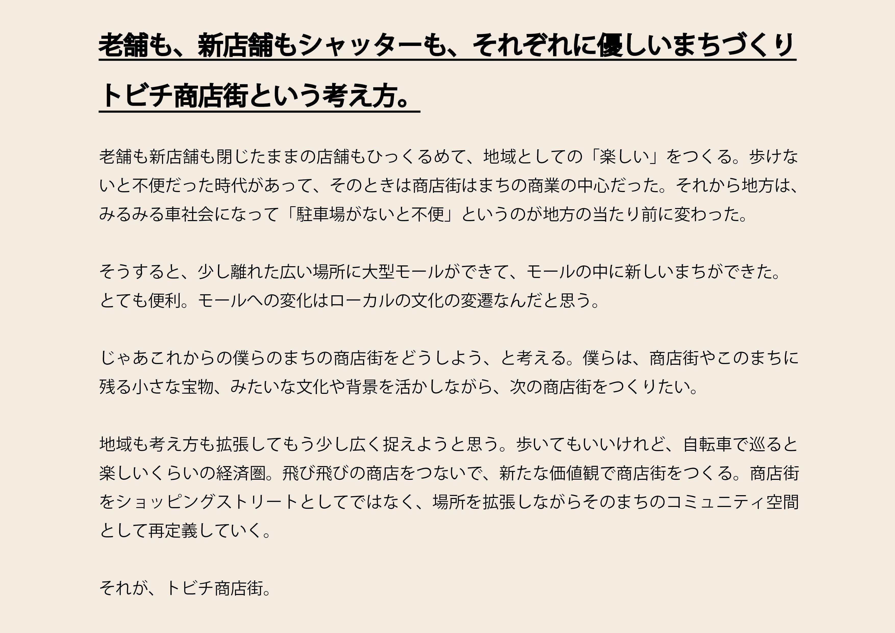 でも、だからこそ僕たちはこのまちで、「トビチ商店街」を実現したい。