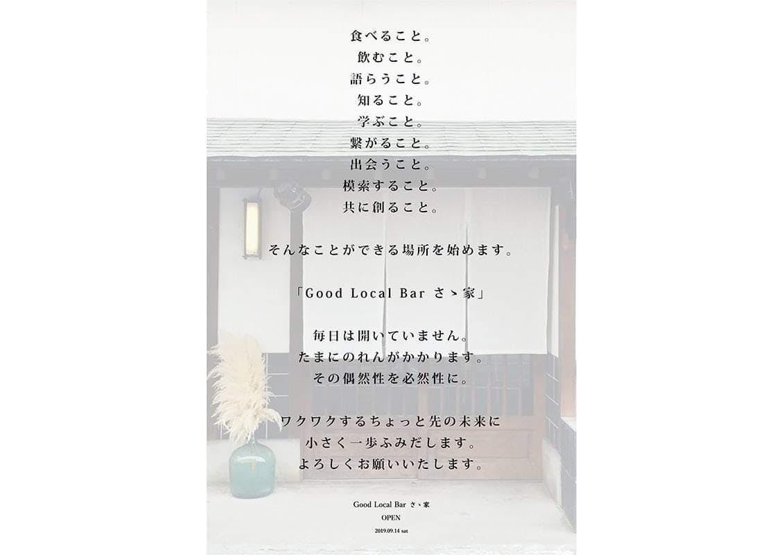 ご主人は60代までお店をやられていて、地域の人がよく行くお店として人気でした。お店を閉じて10年、空き店舗になって1年経っていたところを、僕たちはお店の想いと名前を引き継がせて頂き、「Good Local Bar さゝ家」という名前で、9月にお店をオープンさせました。