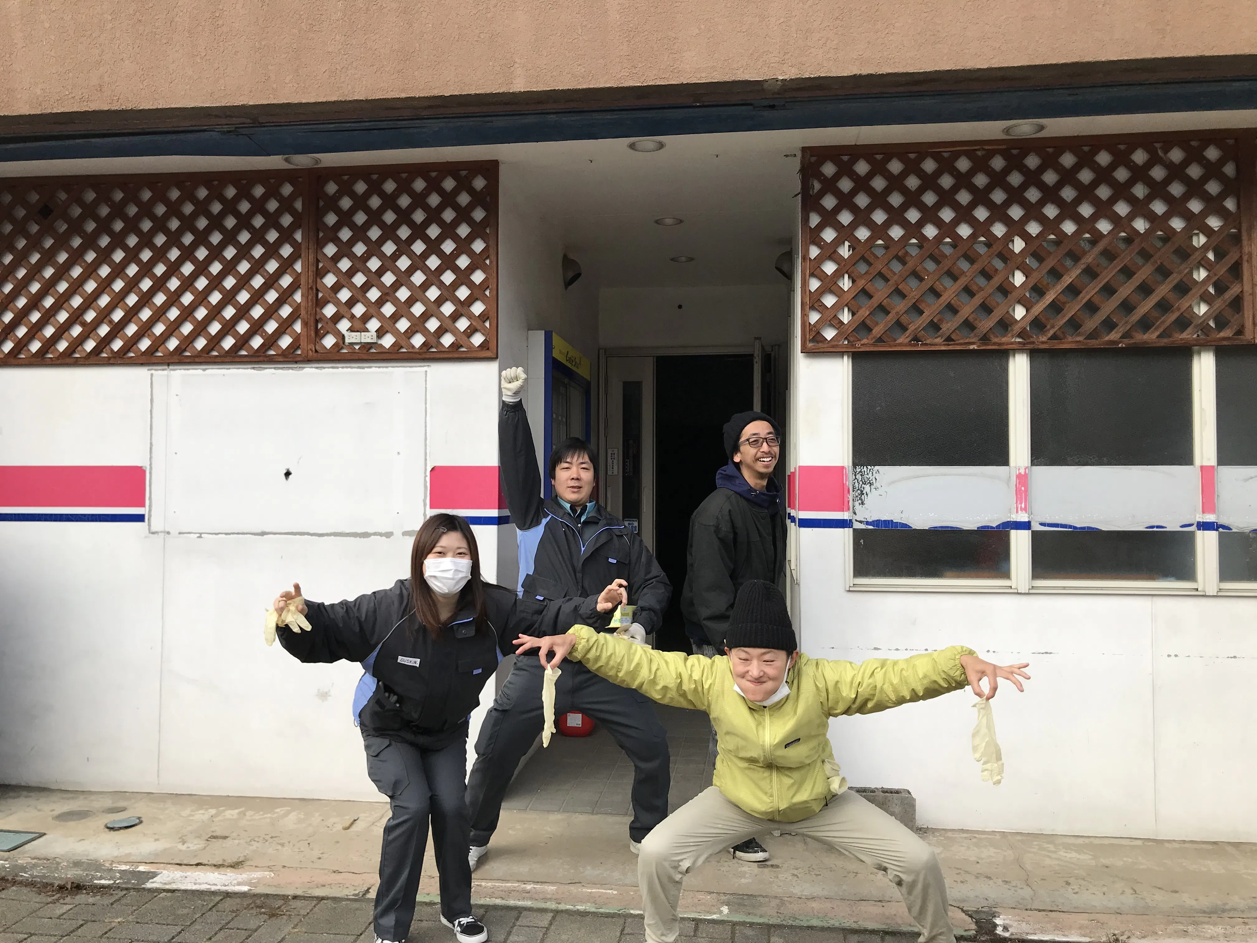 この物件は、まだ水と電気を止めたままなので、間接照明でムーディーな中、みんなで汗をかいて頑張りました!