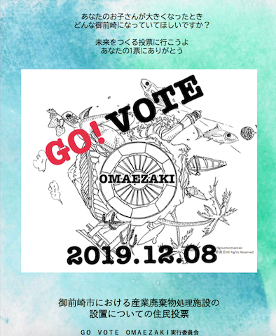 私たちは、2019年12月8日に、静岡県御前崎市で初めて行われる予定の「御前崎市における産業廃棄物処理施設の設置についての住民投票」に、未来へのバトンをうけつぐ若者、子育て中の世代が一人でも多く興味関心を持ち、自分ごととして考え、投票に足を運んで欲しいと願い、活動をしています。