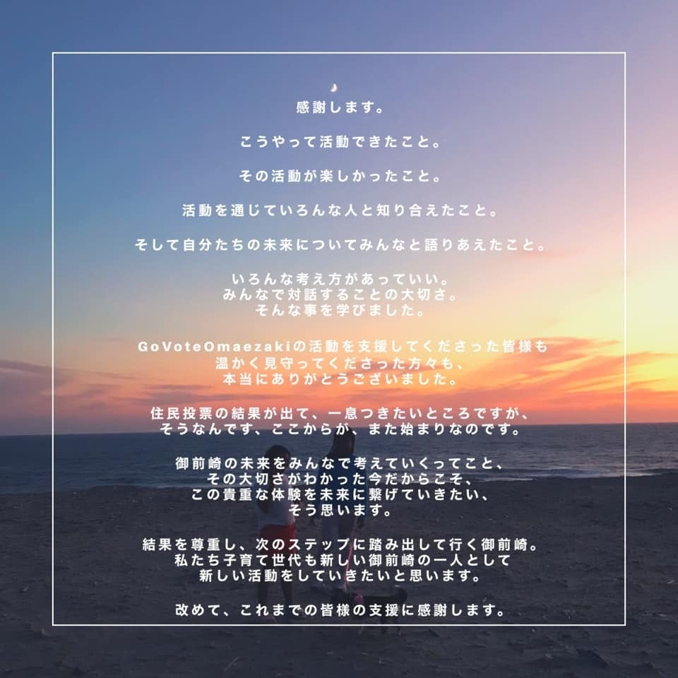 そのような中で「住民投票を実施したい」という署名が、御前崎市の有権者の44%にあたる1万1829人分集まり、12月8日には静岡県で「初」の「市民の直接請求から生まれた」住民投票が実施される事となりました。