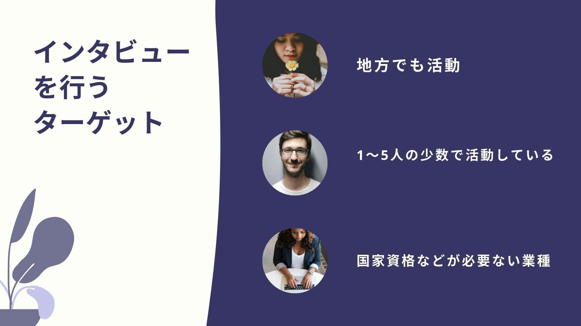 ※人脈なしでの、体当たりの取材となるので、どういった業種の方とお話できるか、現状としては断定できていません。