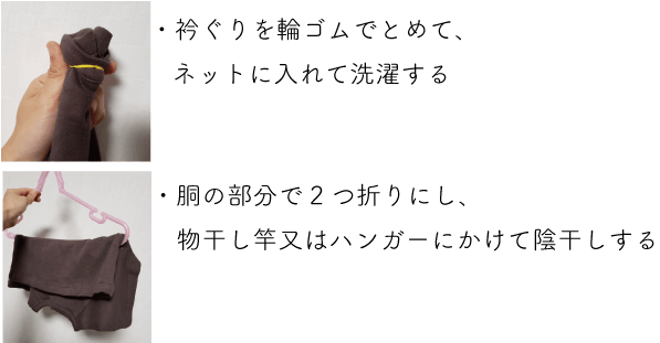 ・洗濯後、乾かないうちにTシャツの形を整え、胴の部分で2つ折りにし、物干し竿又はハンガーにかけて陰干しすることをお勧めします。