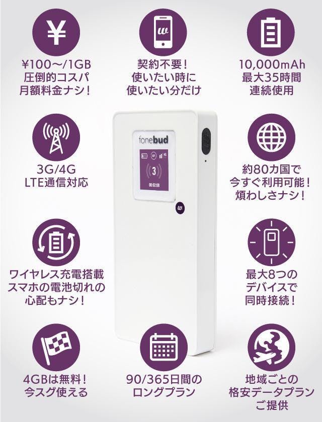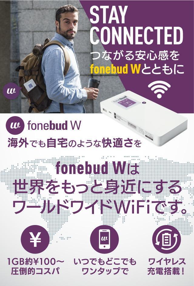 海外でインターネットを使う上での問題点を全て解決するのが、世界約80ヶ国で使える最大35時間連続使用が可能なグローバルWiFi「fonebud W」です!