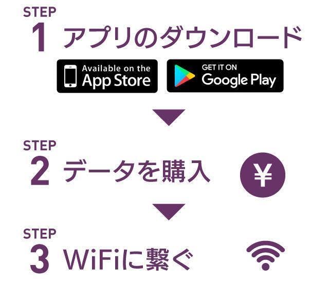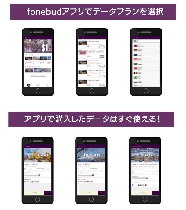 専用AppをDLしていただき、App内にあるデータプランから利用用途に合わせたものをチョイス!データを購入したらあとはfonebud Wのスイッチを入れてWiFiに繋ぐだけ!空港に到着してスグにインターネットをお使いいただけます。