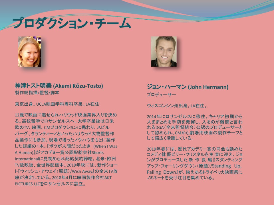 高校留学に始まり短大卒で飛び込んだ映像業界。あっという間に20年以上です。これまでに百本近くのTV、映画、CM製作に携わり、スピルバーグ、タランティーノといったハリウッド大物監督作品の製作チームに加わるという機会にも恵まれました。そしてこのたび、その大好評を得たショート作品をもとに劇場用の同名長編映画を作る運びとなり、皆様にご支援のお願いをするに至っています!