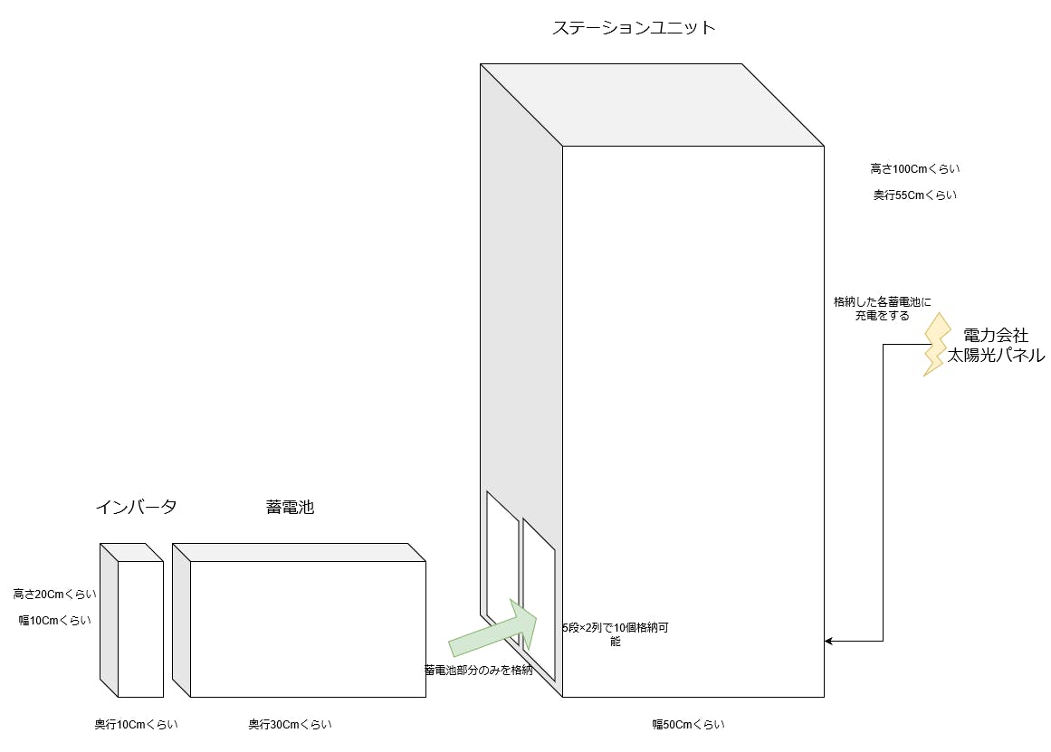1つの蓄電池の蓄電量は620whを目指しています。つまり10個格納すると6kw強になります。