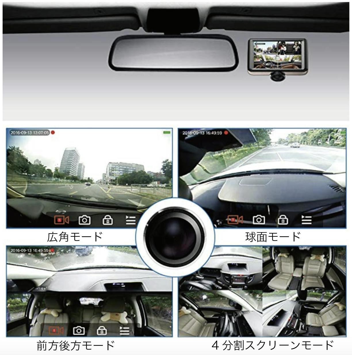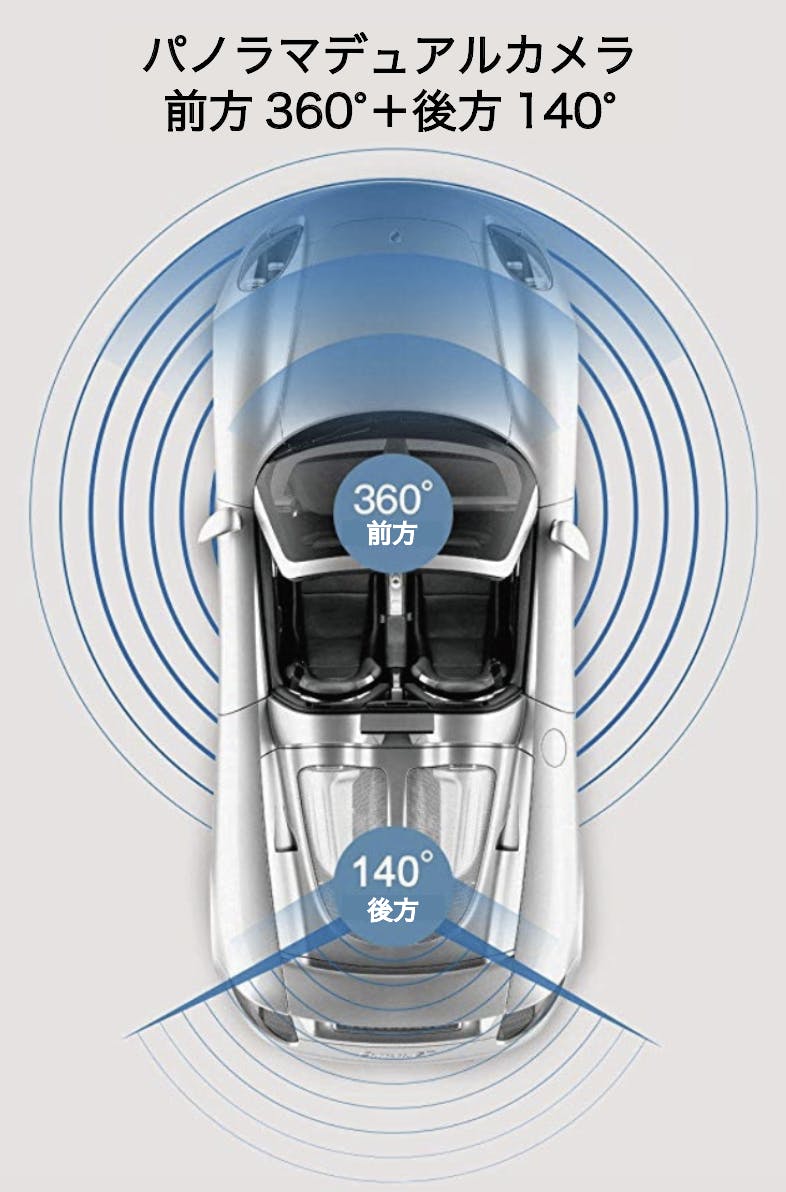 前方360°および後方140°のカメラの使用で死角無し!車の周囲を左から右および前後にパノラマ表示できます。 1080PフルHD前方カメラと720P後方カメラで走行を記録します。