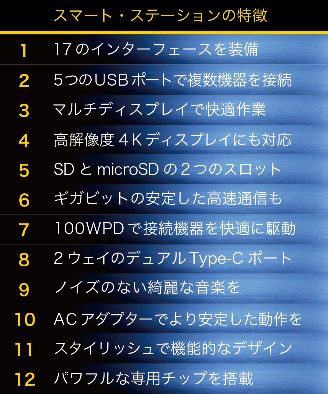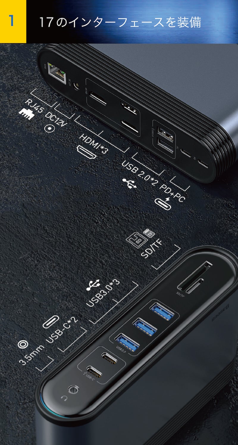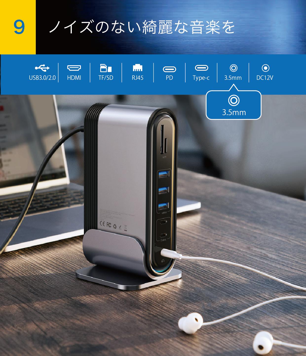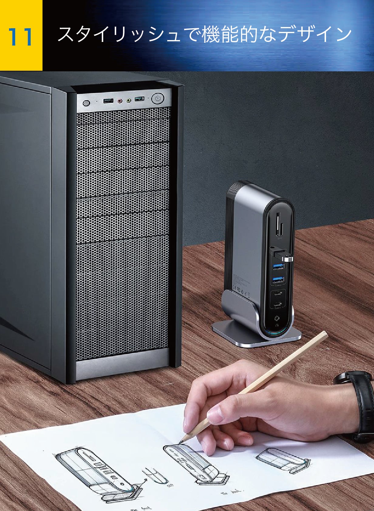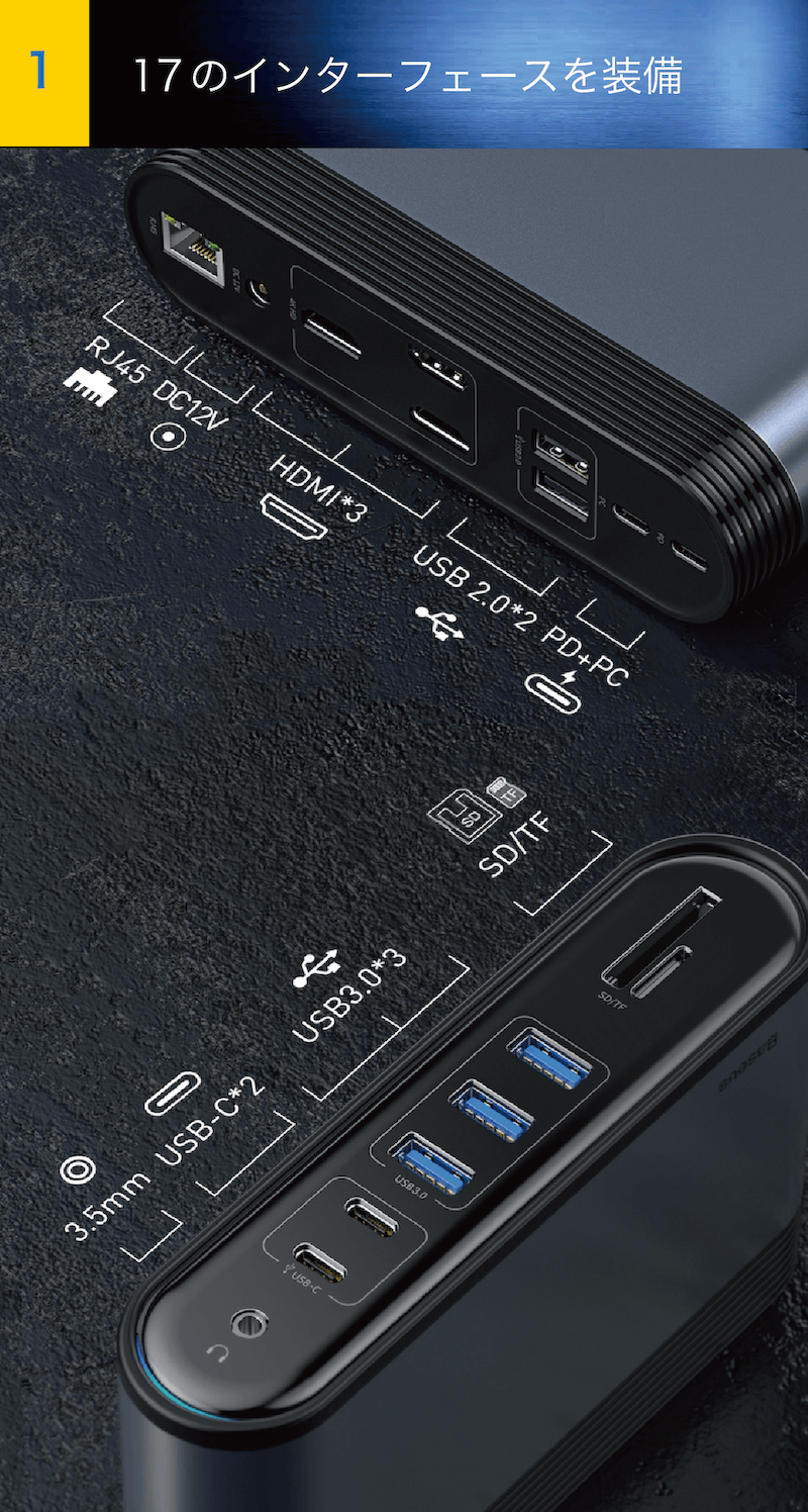 スマートなノートPCとも合う、ホストコンピューターのような垂直型の、スペースを取らないスタイリッシュなデザイン。17つのポートを前後の両面に分布させ、ケーブルを抜き差しやすいように設計されています。