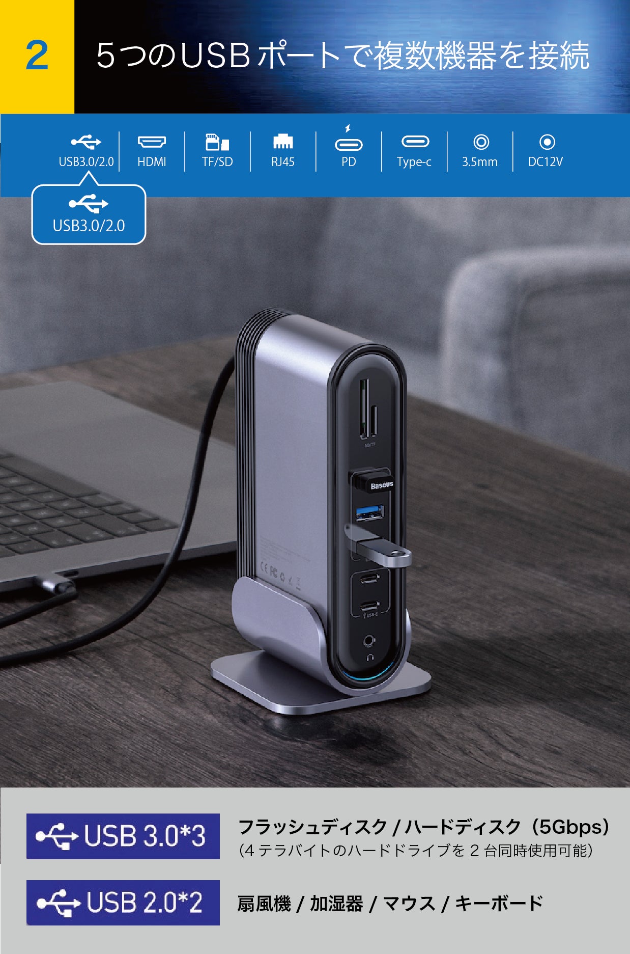 3つのUSB3.0ポートと2つのUSB2.0ポートを備える【スマート・ステーション】は、複数の機器を簡単に接続できます。伝送スピードが最大5GbpsのUSB3.0ポートを使えば、4テラバイトのハードディスクの能力を最大限に活かしながら2台同時に繋ぐことも!ノートPCでは難しかった動画編集など大容量データの作業も快適に。2つのUSB 2.0ポートは、キーボードとマウスのより安定した接続をサポートします。