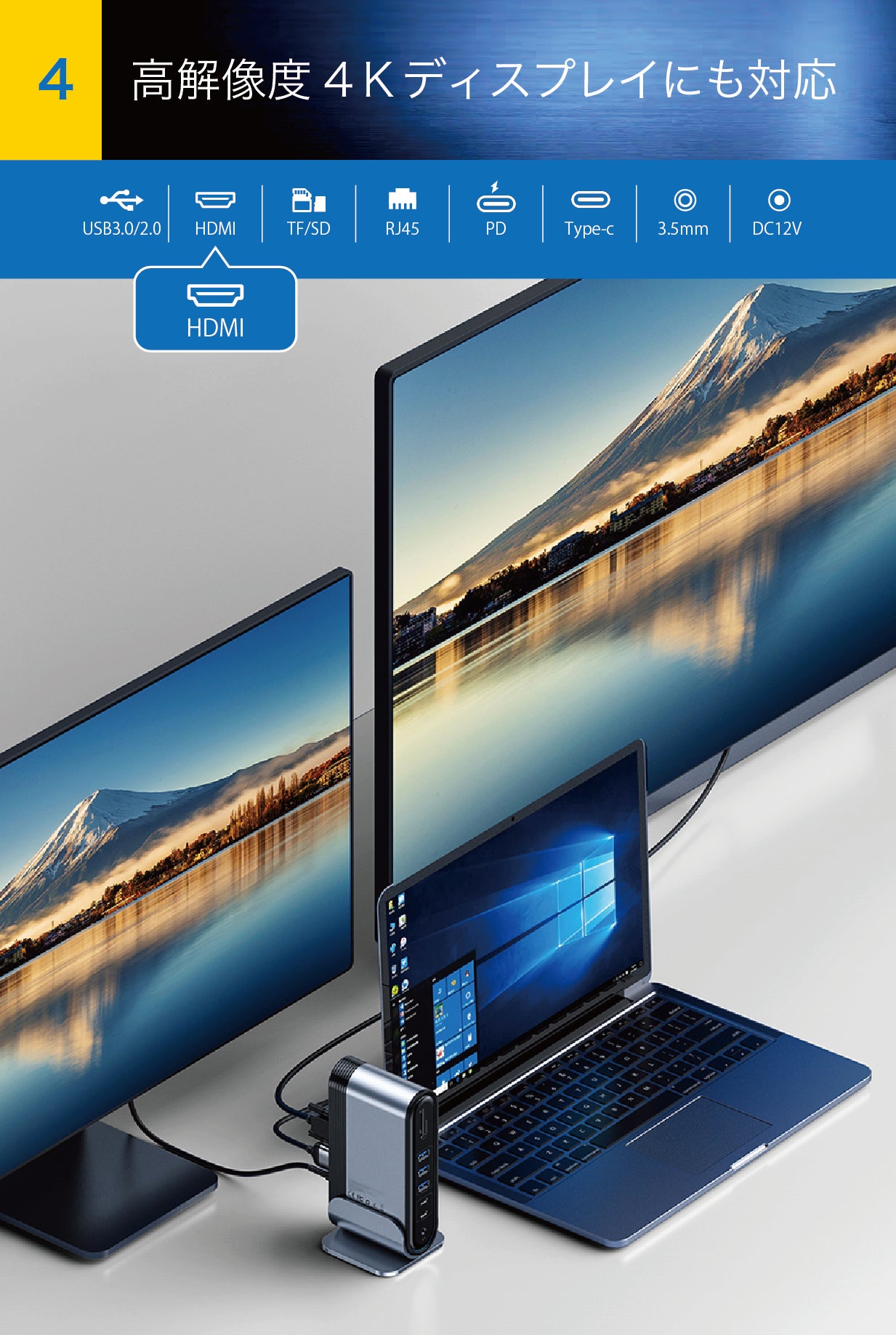 ※HDMIポートへ接続するディスプレイが1つの場合には4K/60Hz、2つの場合には4K/30Hz、3つの場合には1080Pと、HDMIポートへのディスプレイ接続数により最大画質が変わります。