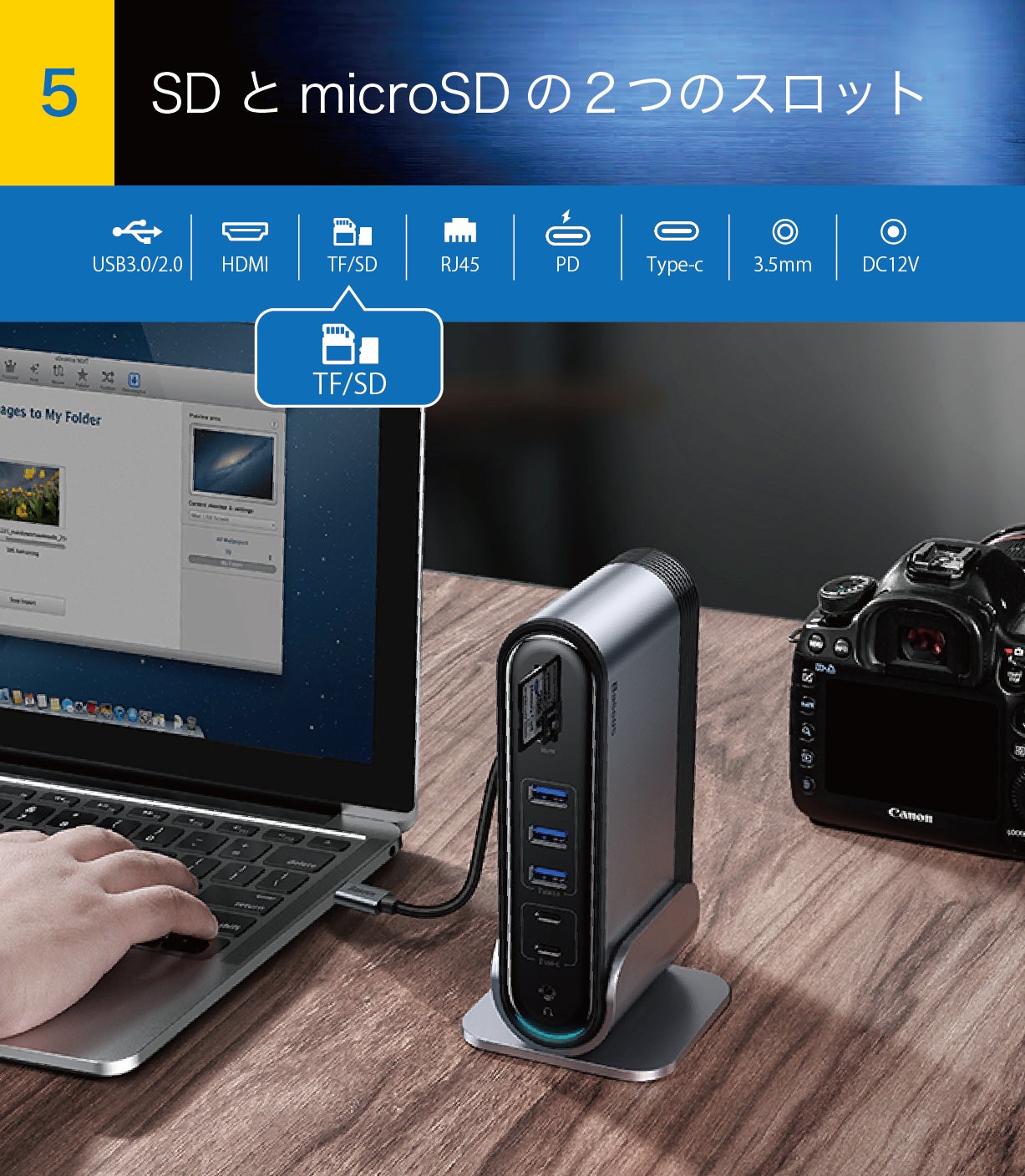 写真家やビデオ編集者のニーズも満たすよう設計された【スマート・ステーション】は、メディアへの対応もこだわります。映像や画像用メディアとしてプロフェッショナル仕様の機器でよく使われているSDカード用のスロットだけではなく、スマートフォンやタブレットで多く使われているmicro SDカードに対応したスロット(TFスロット)も搭載。変換アダプタ不要のスムーズなアクセスを提供し、あなたの作業を止めません。