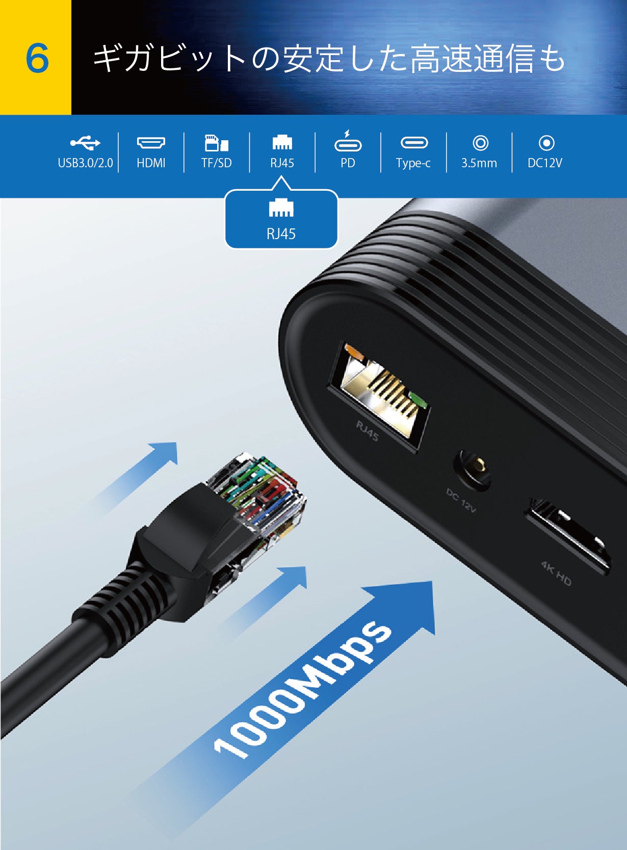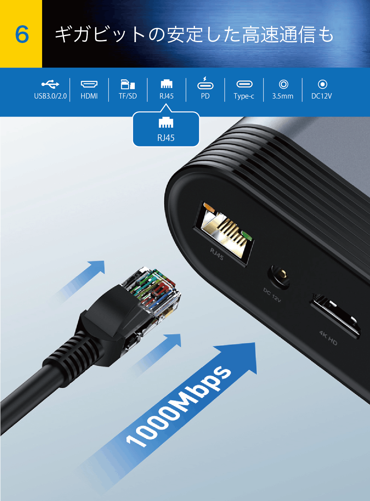 Wi-Fiがない場合やWi-Fi信号が弱い場合はもちろん、より安定したネットワーク環境を使うために有線接続に切り替えることがよくあります。そんな時にノートパソコン本体に接続するのではなく【スマート・ステーション】を有線接続しておけば、Type-Cケーブル1本で、1000Mbpsの安定したネットワーク速度で作業ができます。