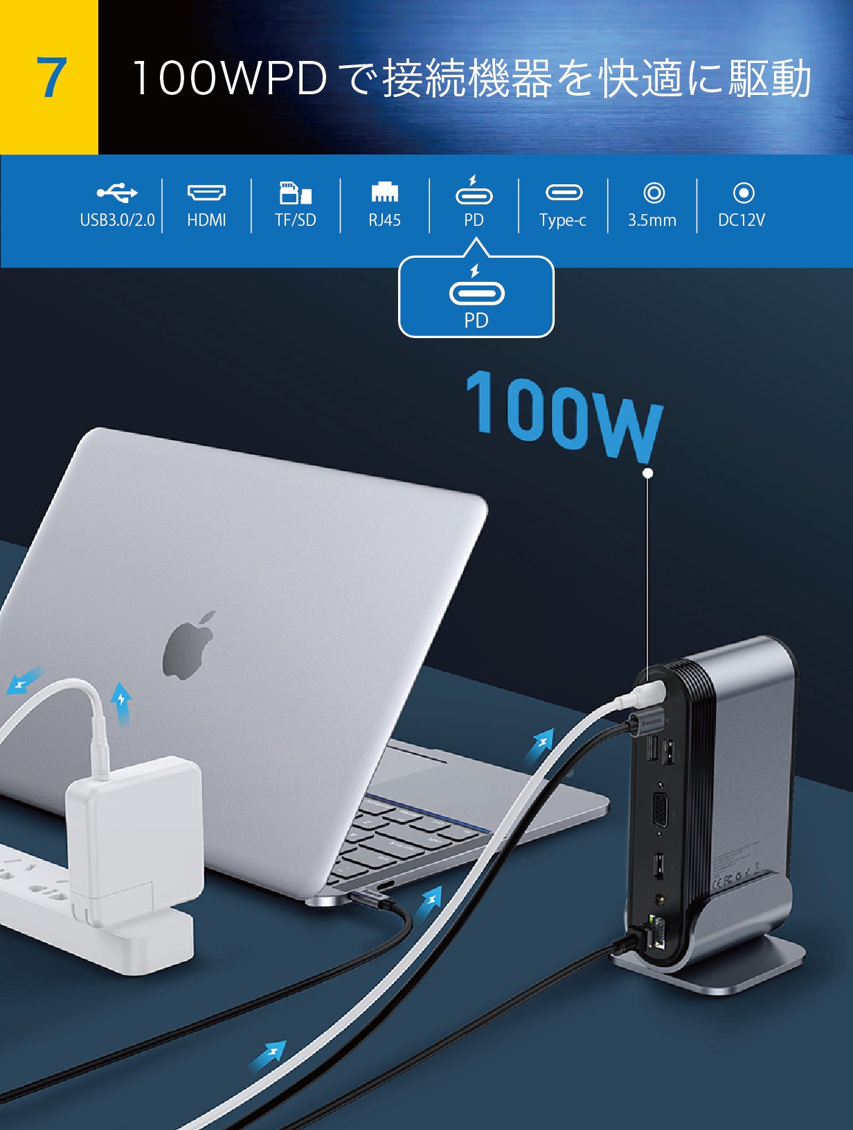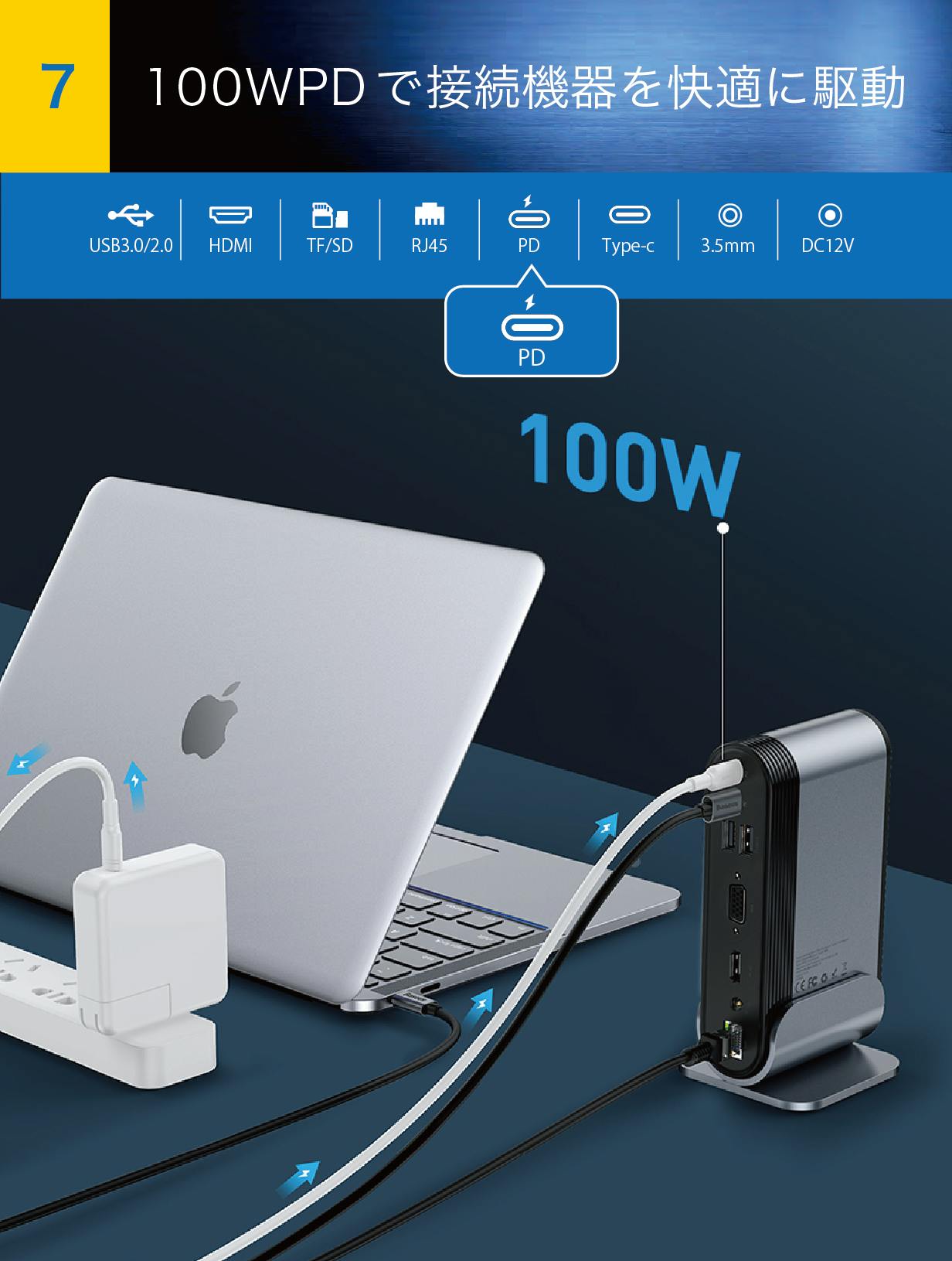 100Wパワーデリバリー対応のACアダプターを繋げば、余裕のある電力供給が可能に。ノートパソコンを充電しながら、周辺機器を快適に駆動させることができます。