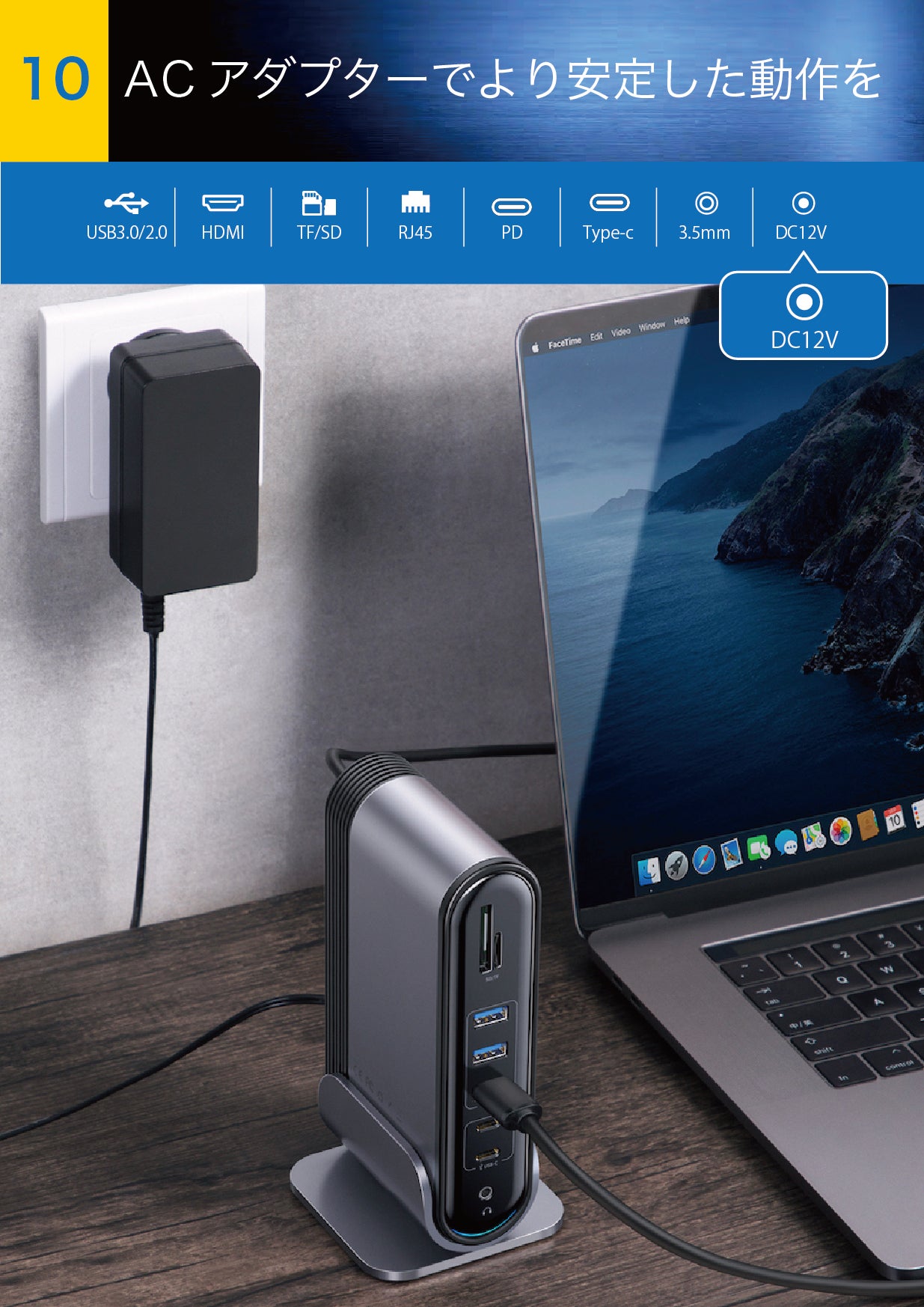 多数の機器を接続できる【スマート・ステーション】だからこそ、ノートPC本体からの電力供給だけでは不安定になる事も。そんな状況を考慮してACアダプターを併用しておけば、より安定した動作が可能になります。