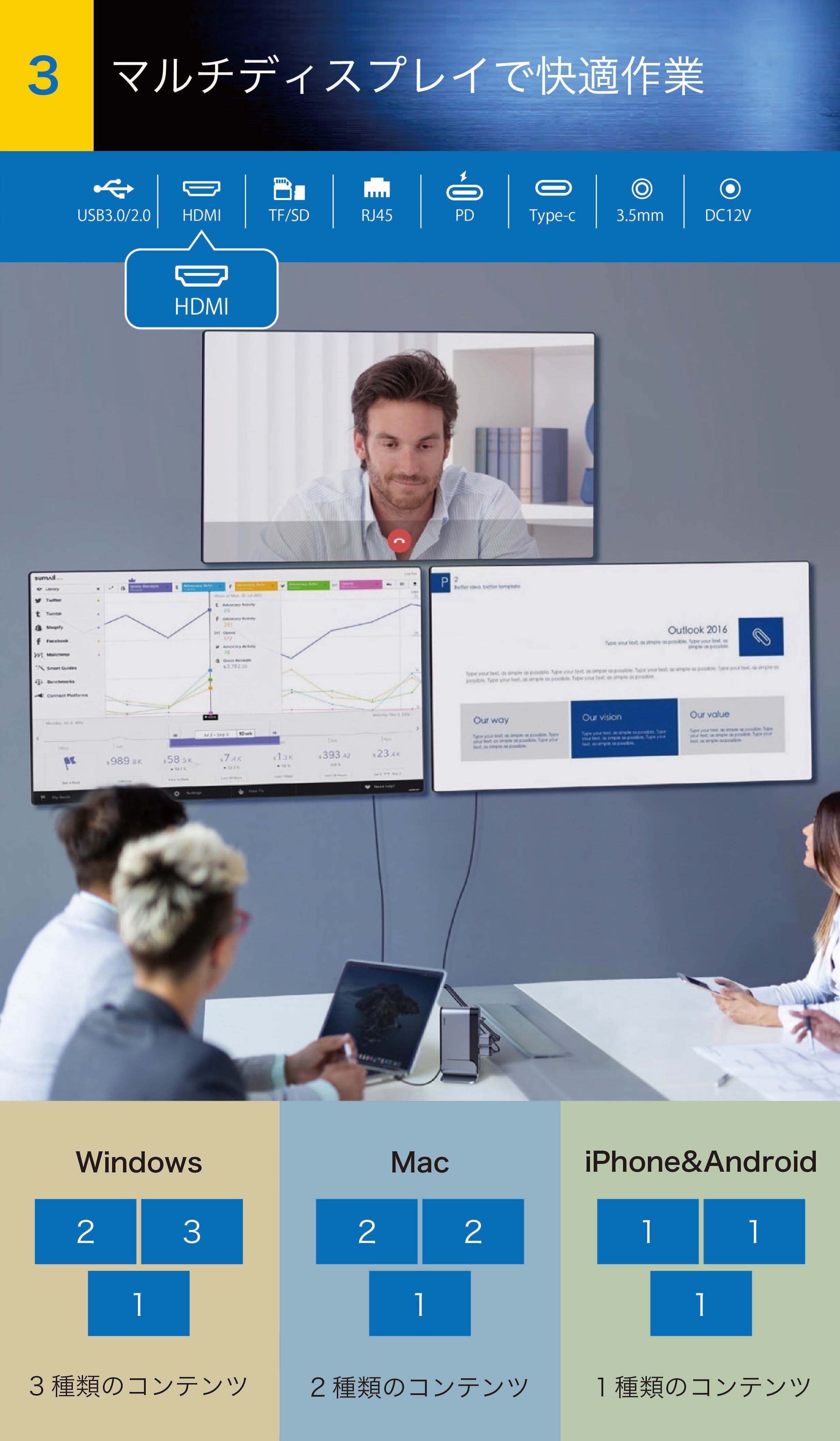 最大で3台のHDMI対応ディスプレイを接続すれば、3画面に別々の情報を出したり、同じ内容を複数の画面に表示するなど状況や用途に応じた使い分けが可能です。