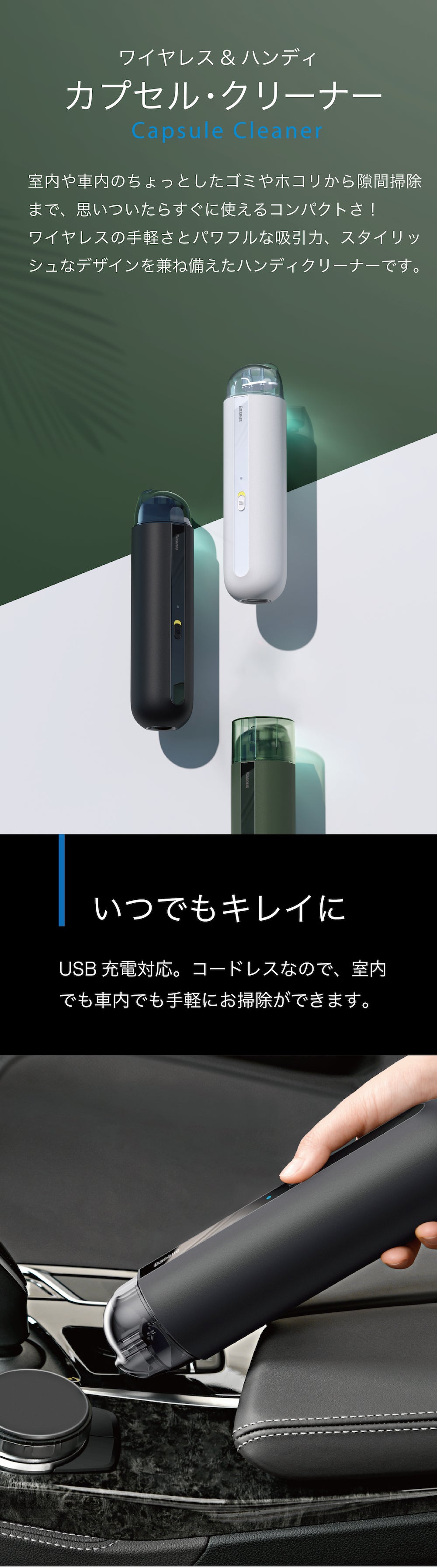 【カプセル・クリーナー】は、室内・車内の清掃に適したコードレスのハンディクリーナーです。シガーソケットからのUSB充電やモバイルバッテリーからの充電ができるため、掃除したい瞬間を逃しません。