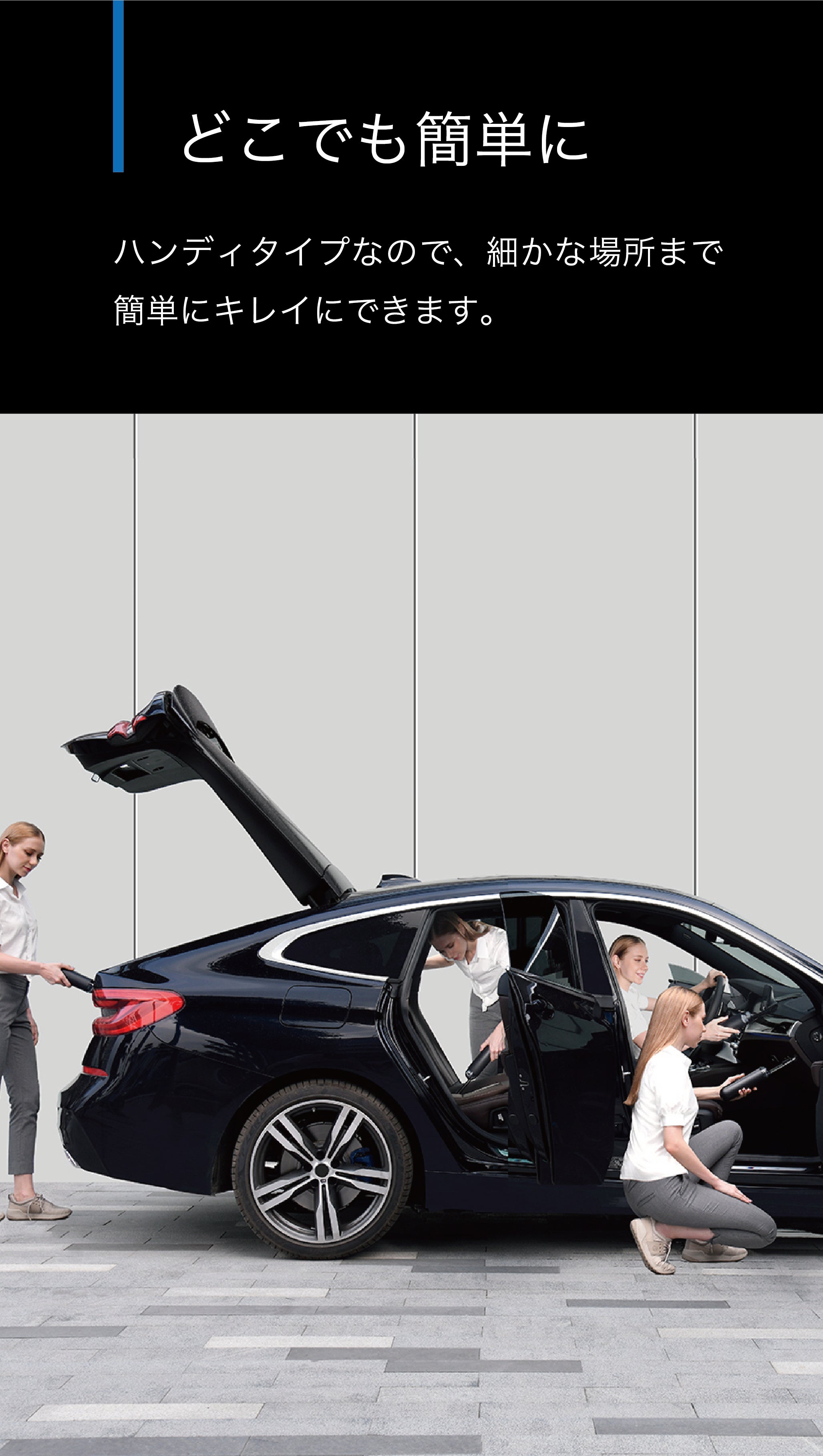 コードレスなので、家の中や愛車のお掃除がカンタン。いつでもどこでも気になったところをサッときれいにできます。