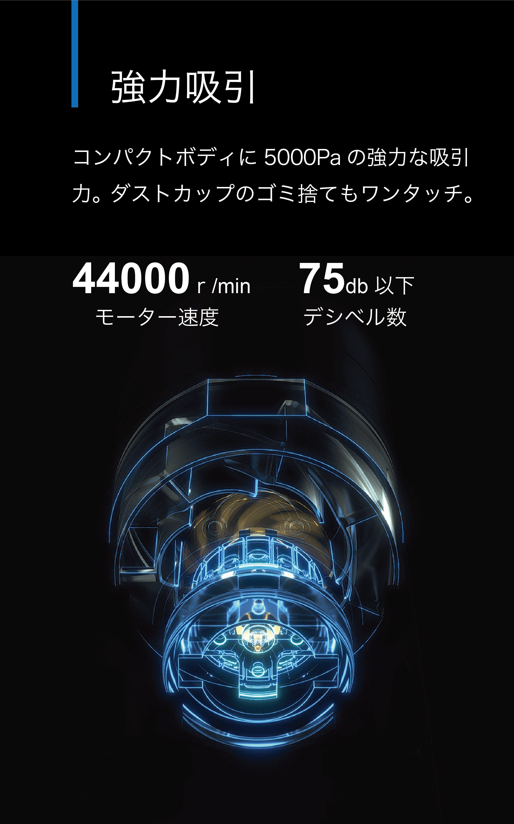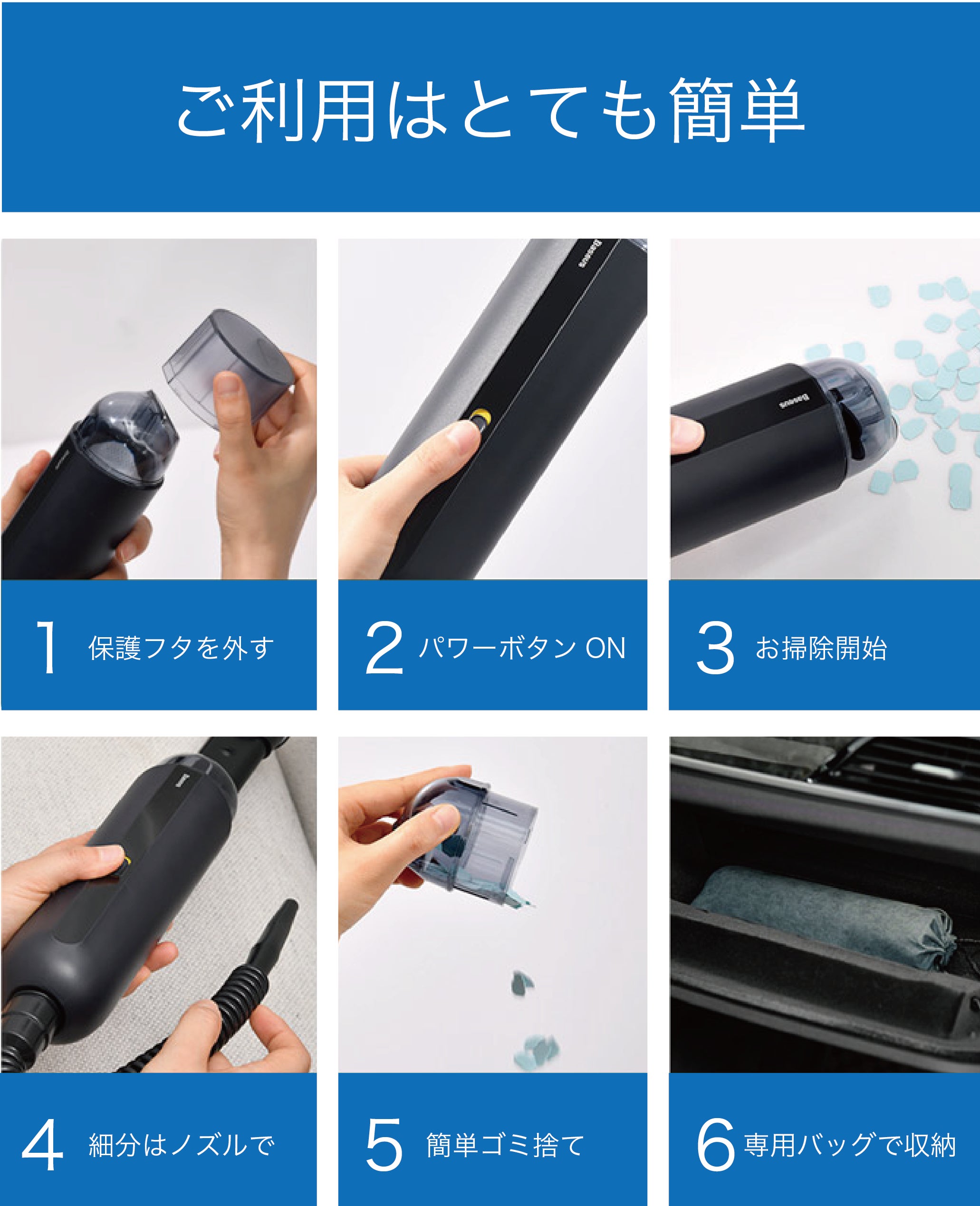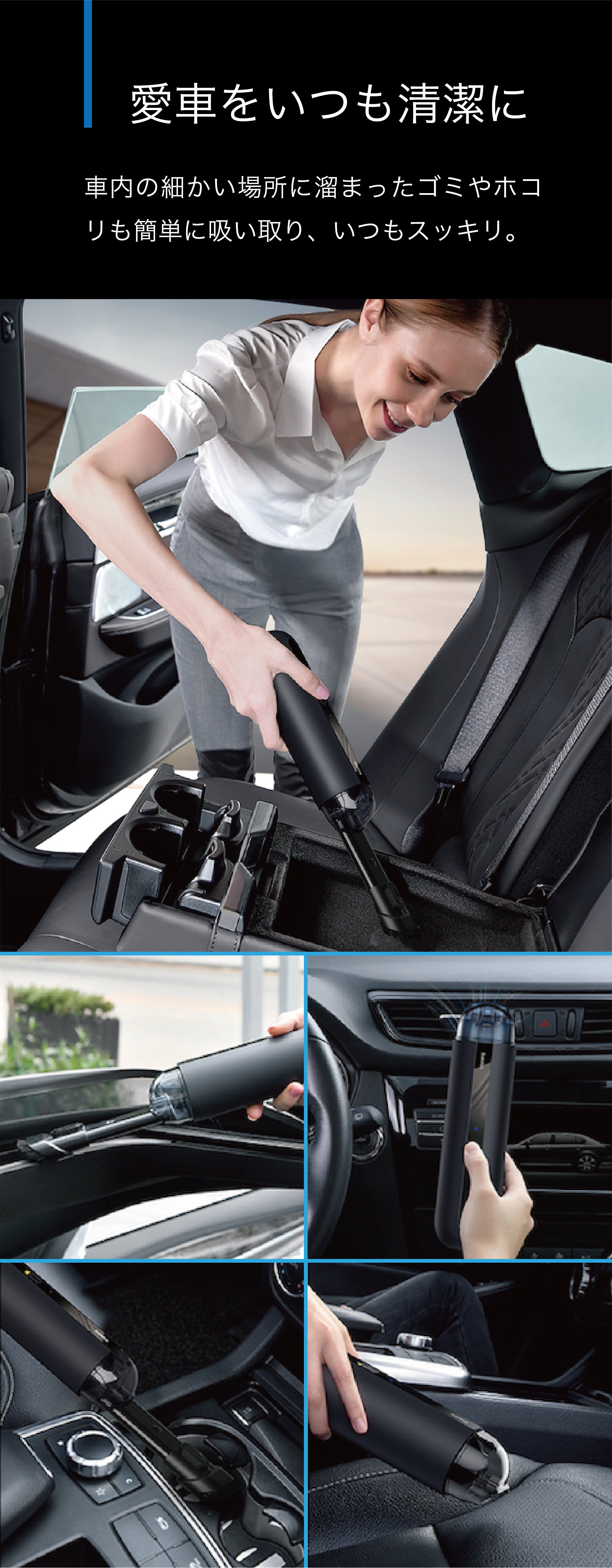 コンパクトながら強力な吸引力で、お部屋や車のゴミやホコリを一掃します。