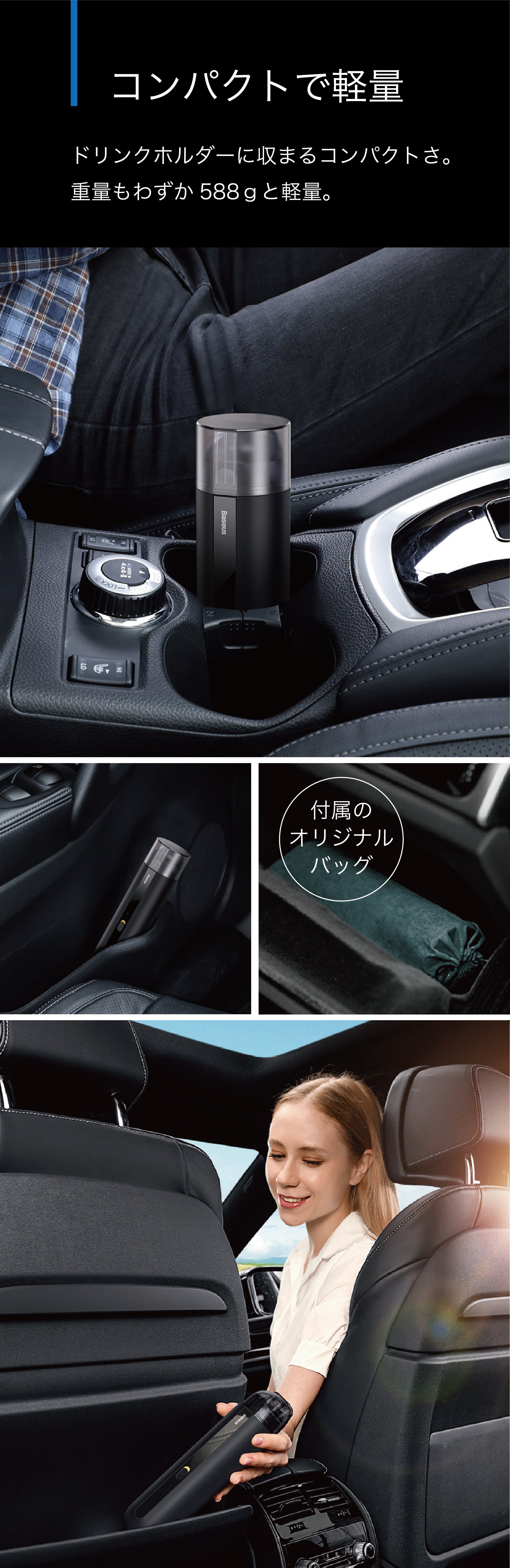 【カプセル・クリーナー】は車のドリンクホルダーにすっぽりおさまるコンパクトさ。ドアポケットやシートポケットにもスッと収まります。重量はわずか588gですので、女性やお年寄り、お子様でも手軽にお使いいただけます。