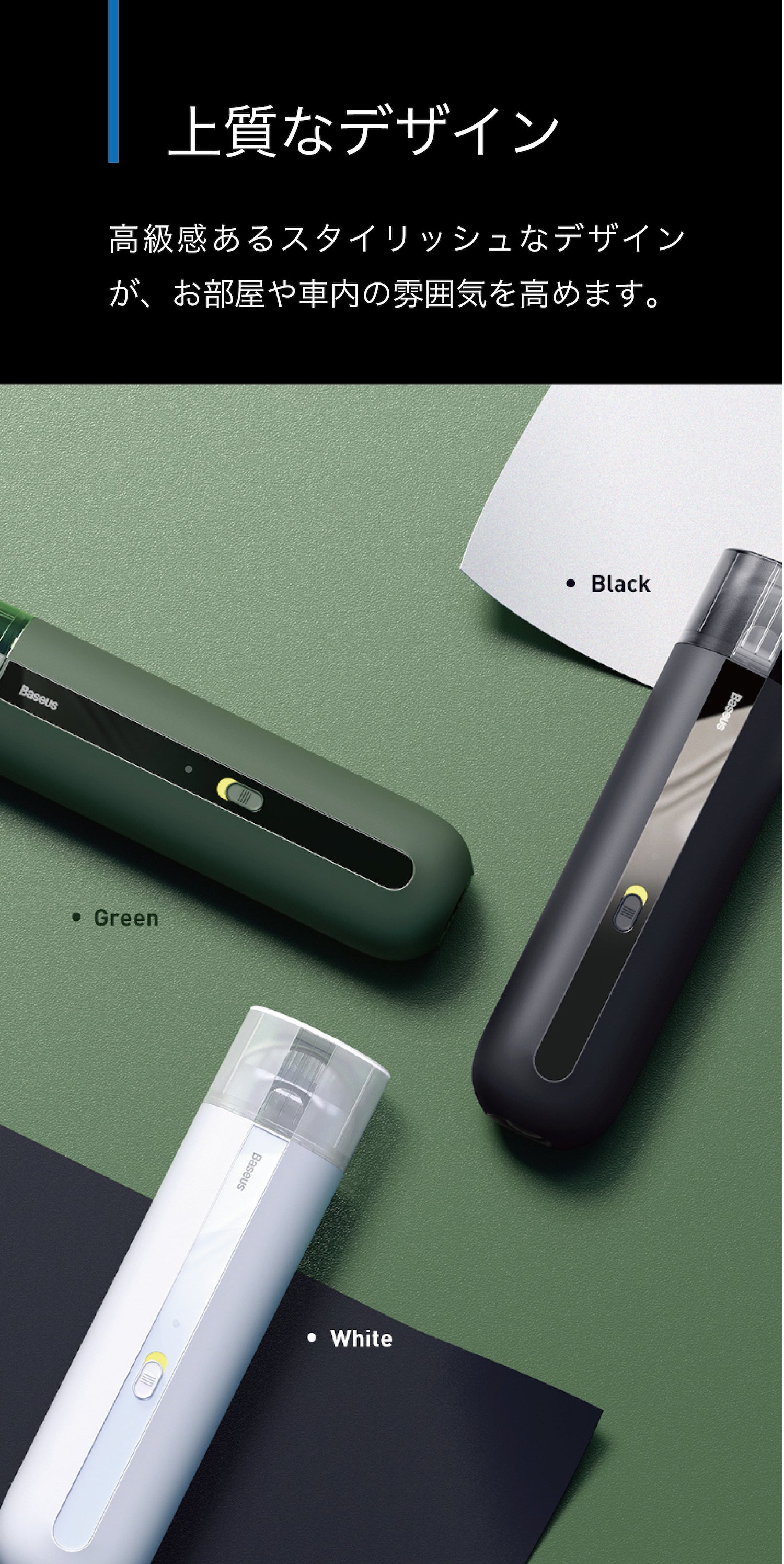 お部屋や車内のインテリアにも調和する高級感あるデザイン。家具や車に合わせて、ブラック、グリーン、ホワイトの3色からお選びいただけます。