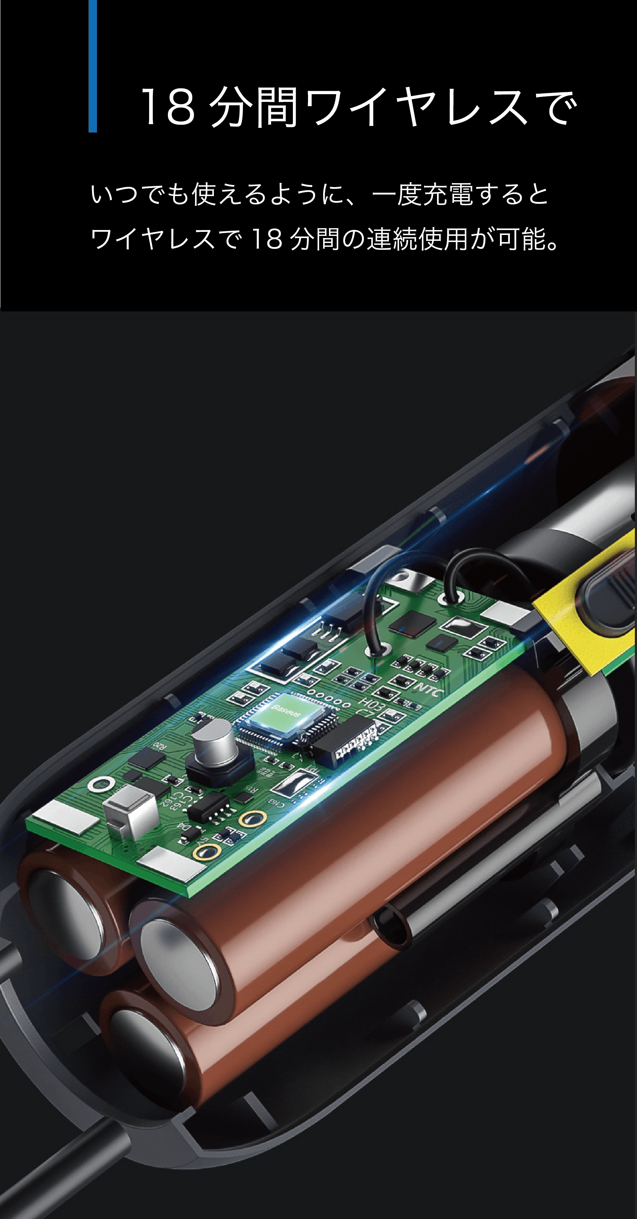 一度充電すると、ワイヤレスで18分間稼働しますので、お部屋も車内も丁寧に細部までお掃除できます。