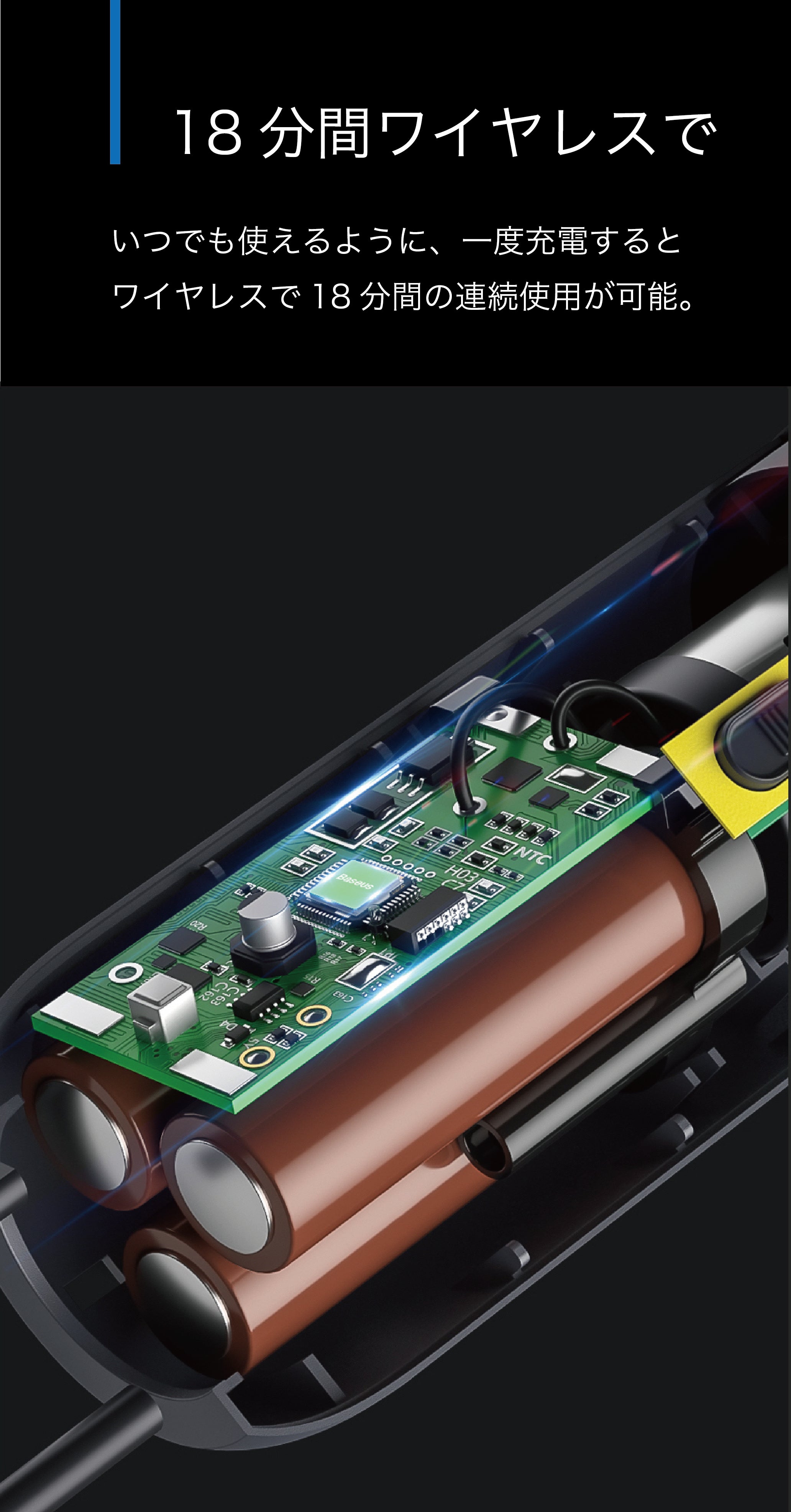 一度充電すると、ワイヤレスで18分間稼働しますので、お部屋も車内も丁寧に細部までお掃除できます。