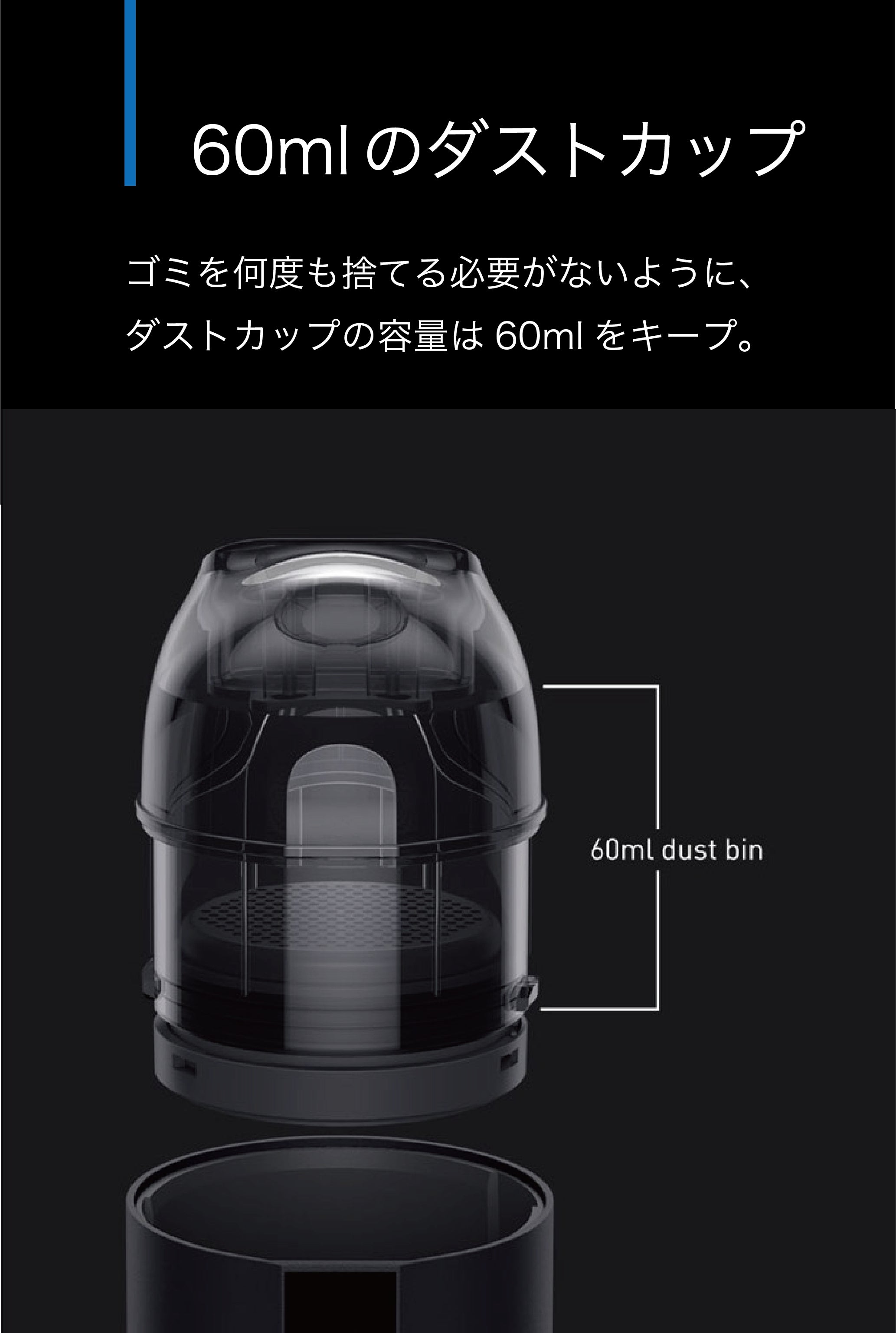 コンパクトでありながら機能性を損なうことなく、60mlのダストカップ容量を確保しました。