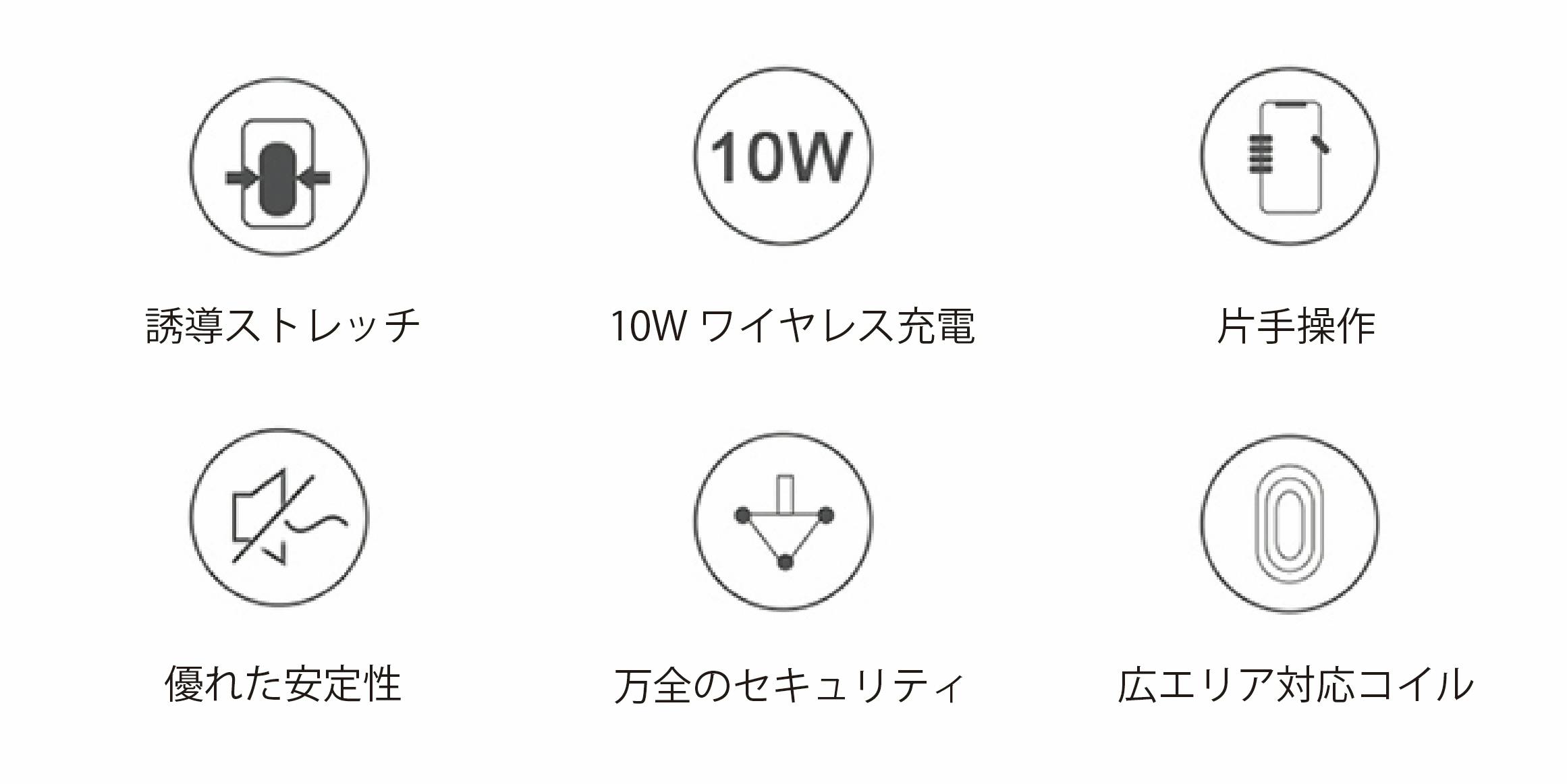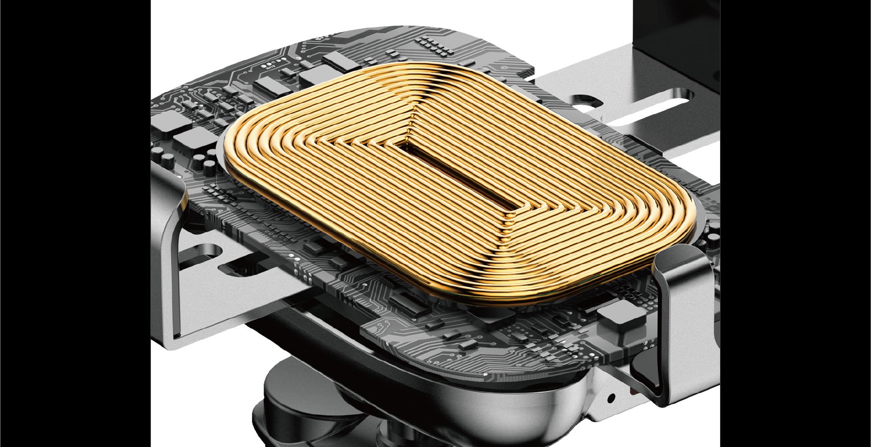 機種を瞬時に識別し、最適なワイヤレス充電が開始。充電コイル内蔵により、デスクトップのワイヤレス充電と同程度の急速充電がされます。