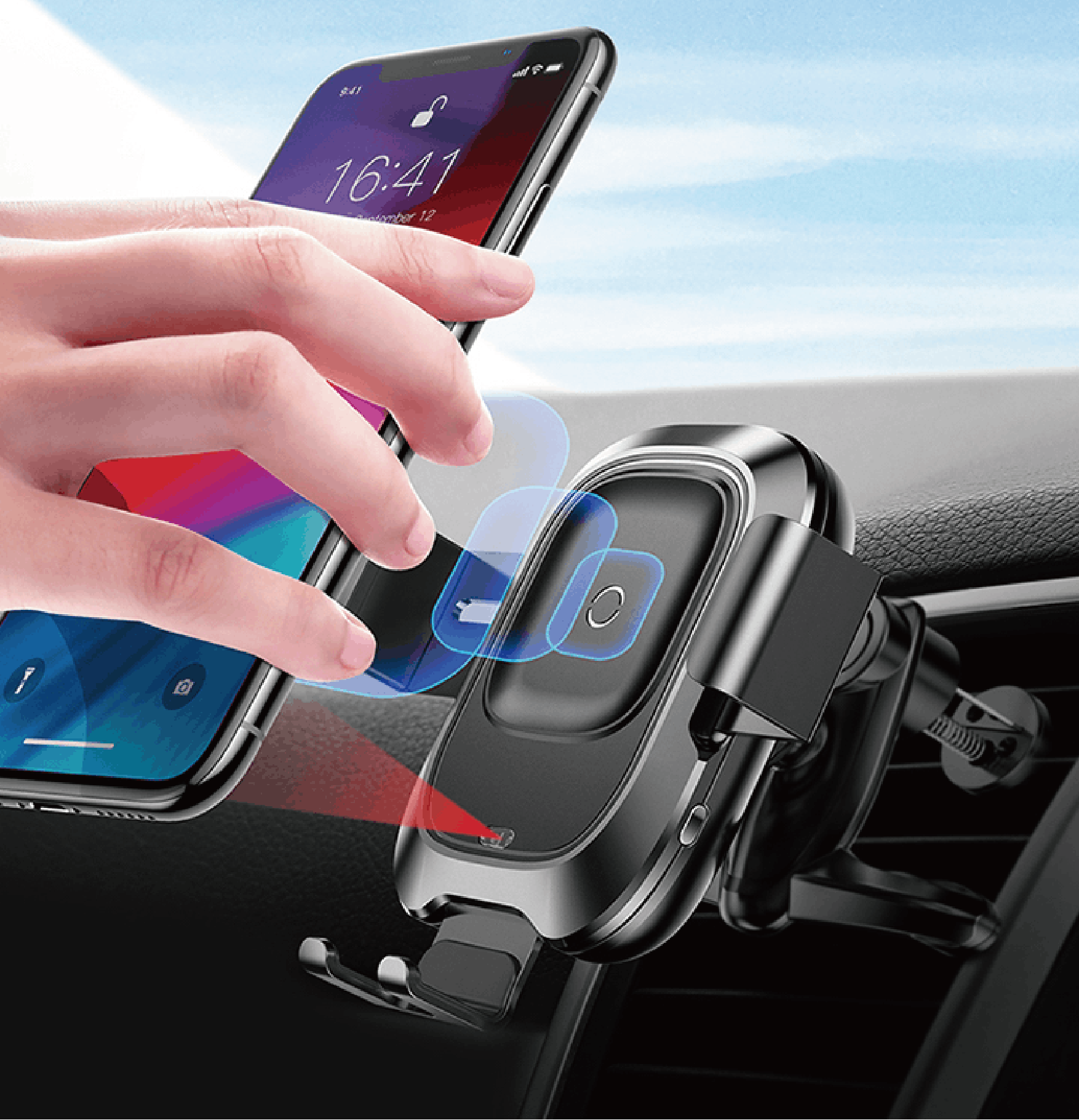 片手でワイヤレスカーホルダーに携帯電話を置くだけで自動的に固定。運転中でもワンタッチでロック解除し、簡単にスマホを取り出せます。