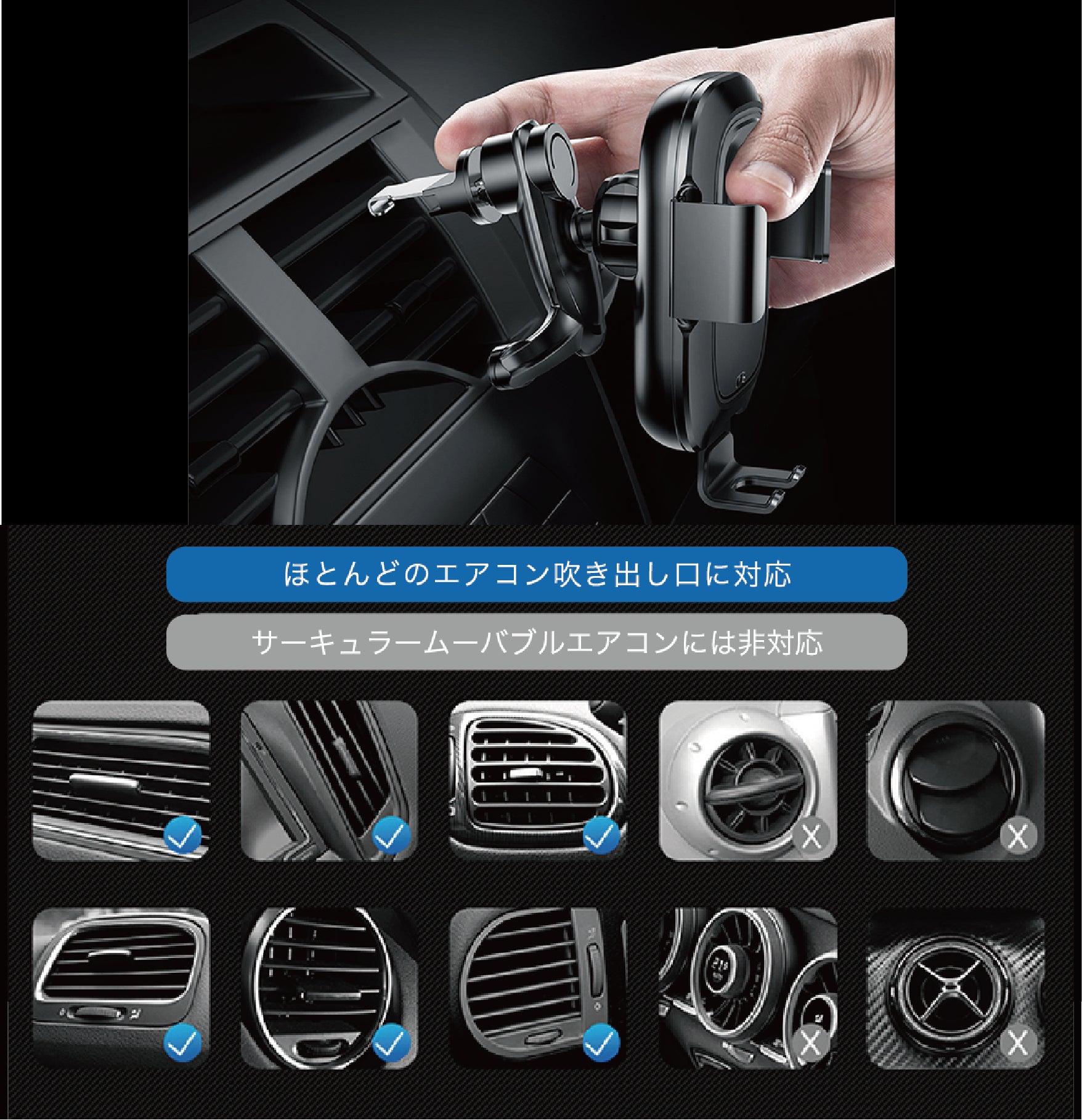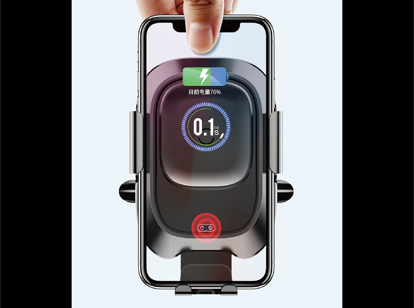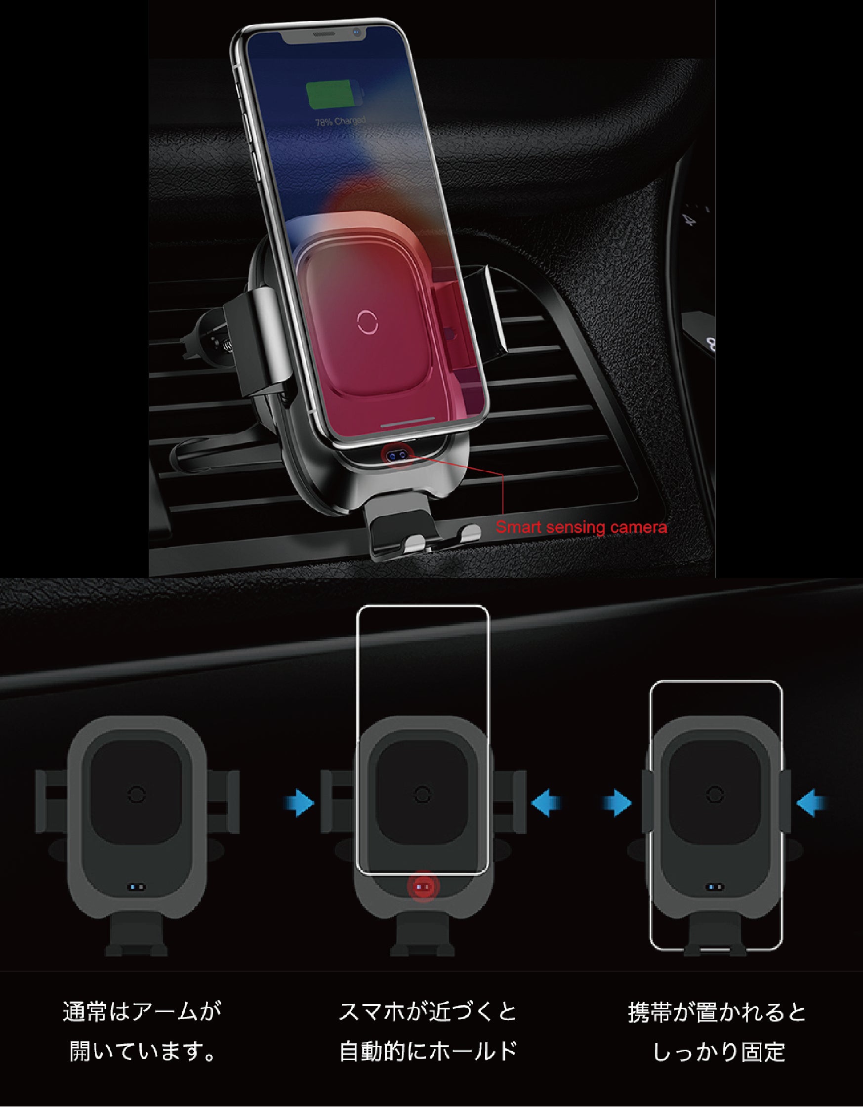 スマホをカーホルダーに置くだけで、センサーにより自動的にアームが閉まりロック。0.1秒でチャージ開始!