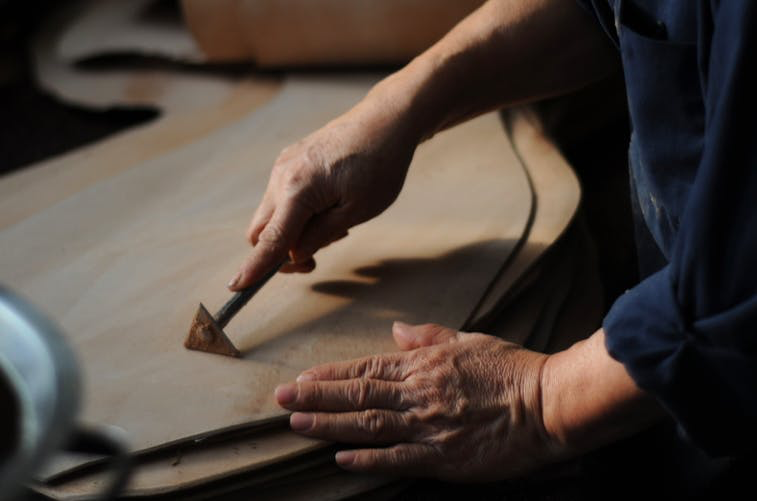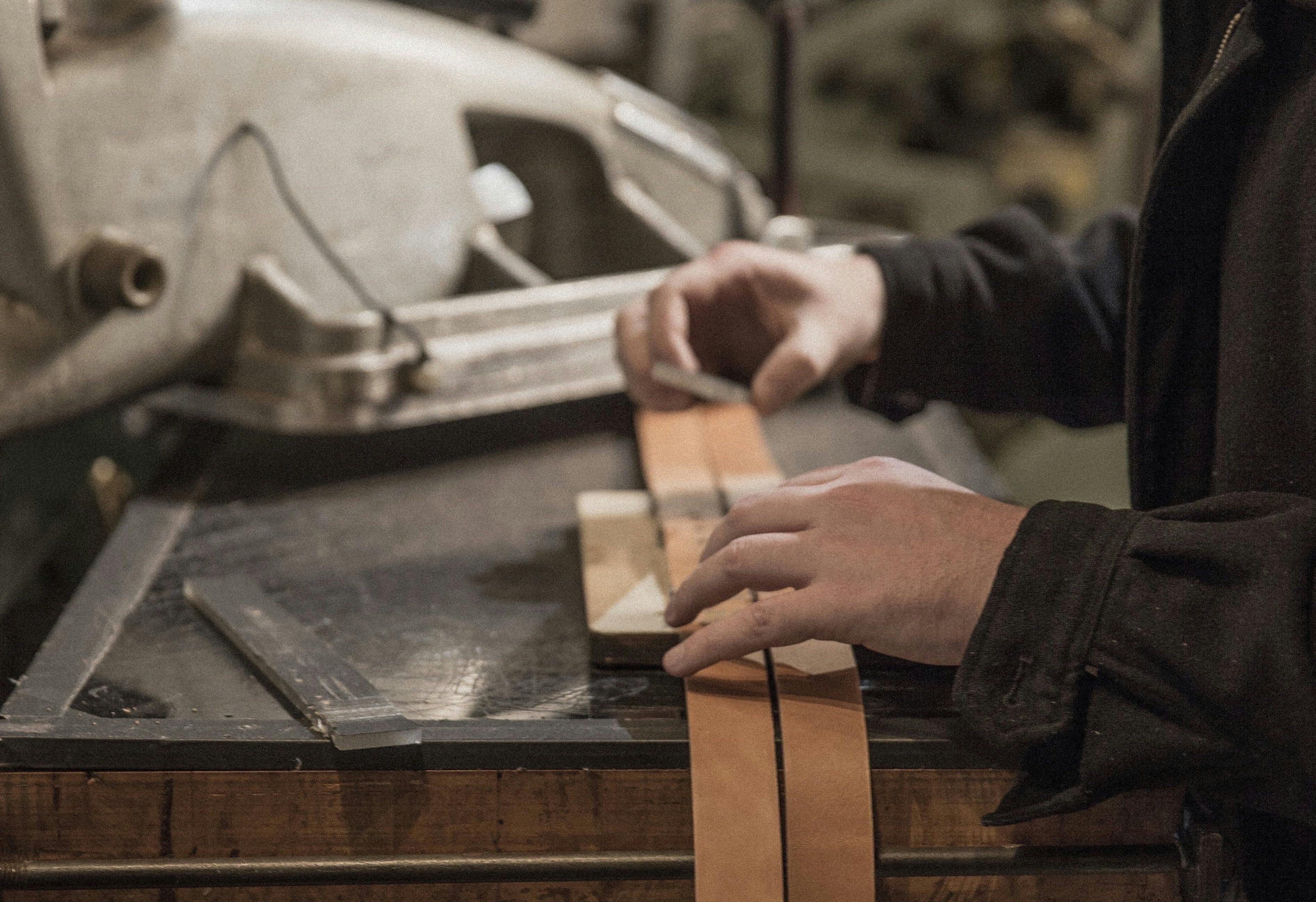 用いる素材は製品の規格に合わせて厳選に選別され、寸法も繊密に計測されます。加工は手作業で行われ、厳しい検査を通過した製品だけに【EZRA ARTHUR】の刻印がされます。