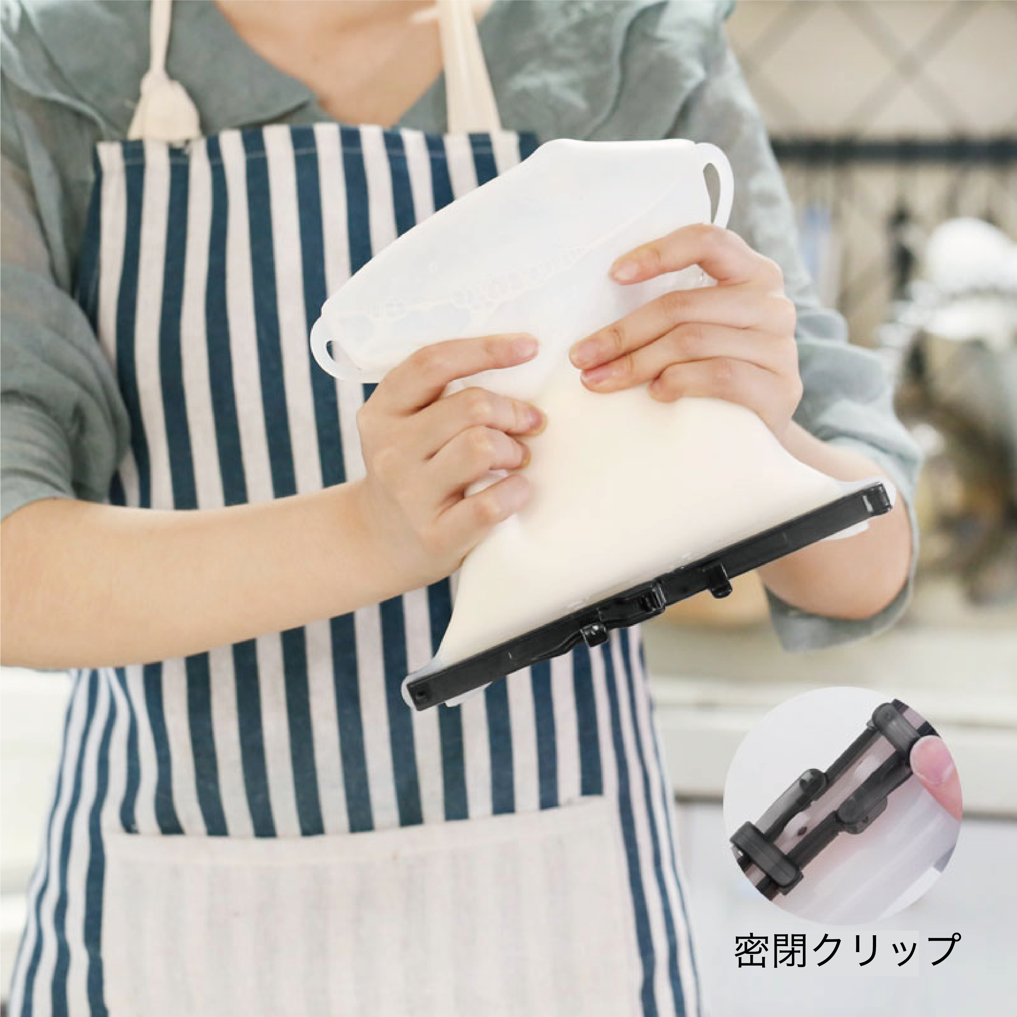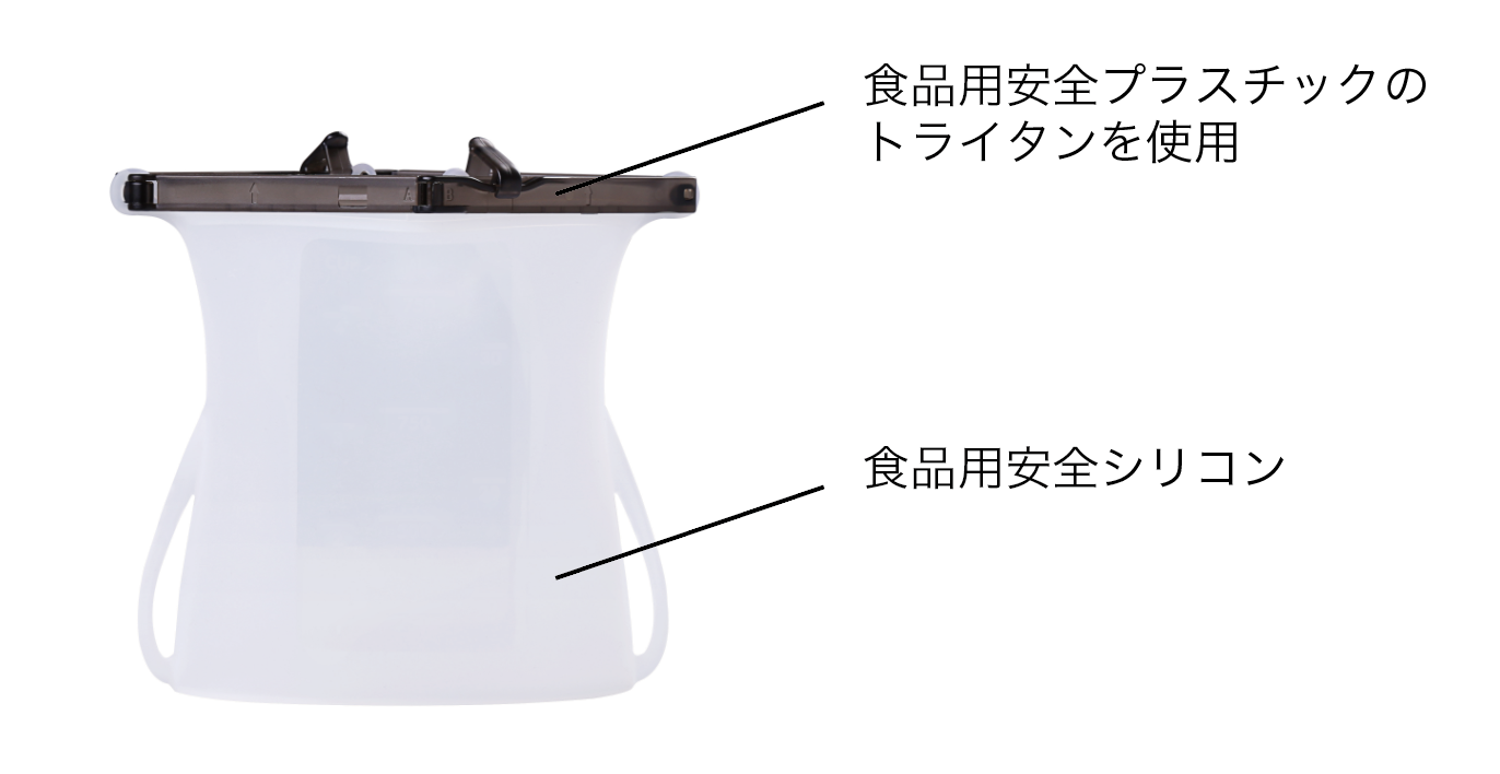 素材は食品用の安全なシリコンを使用し、BPA(健康被害のあるプラスチック)、ポリ塩化ビニル(添加剤を多く含むプラスチック)、フタル酸エステル(プラスチックを軟らかくするための可塑剤)、石油は使用していません。クリップ部分のプラスチックは、食品用安全プラスチックのトライタンを使用しています。
