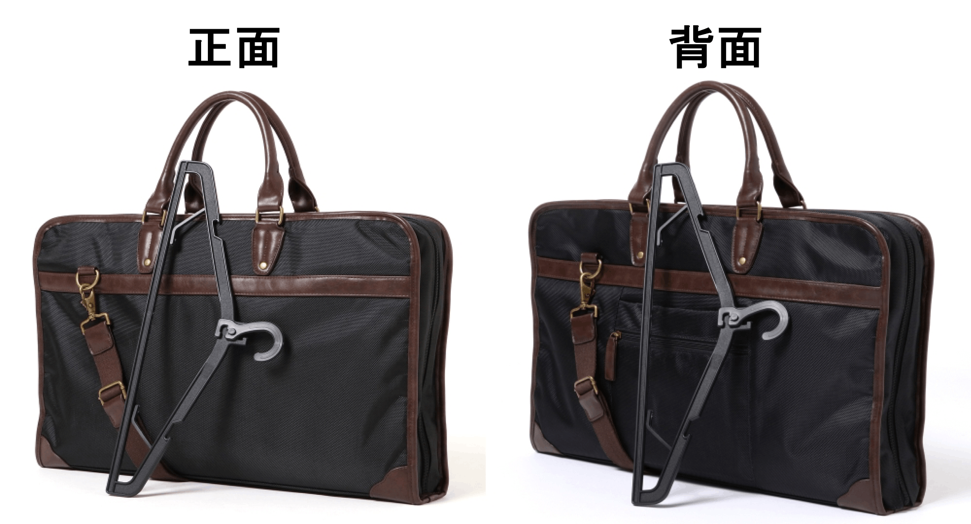 スラックス掛け、ネクタイ掛けがついた丈夫な高級ハンガー付き。ハンガーのヘッド部分は360度回転するので、ガーメントバッグ内ではヘッド部分を折りたたんだ状態で引っ掛けられます。ホテルでは通常のハンガーとしてお使いいただけます。