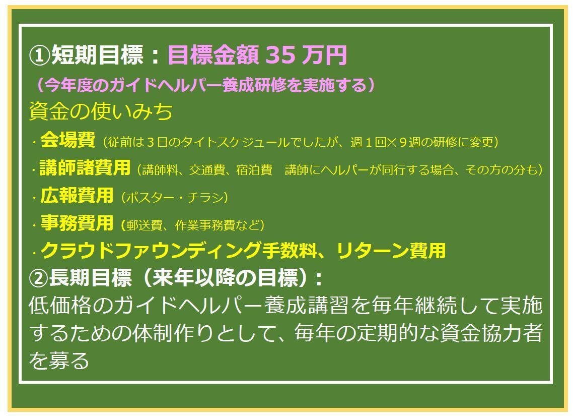 ①短期目標:目標金額35万円(今年度のガイドヘルパー養成研修を実施する)