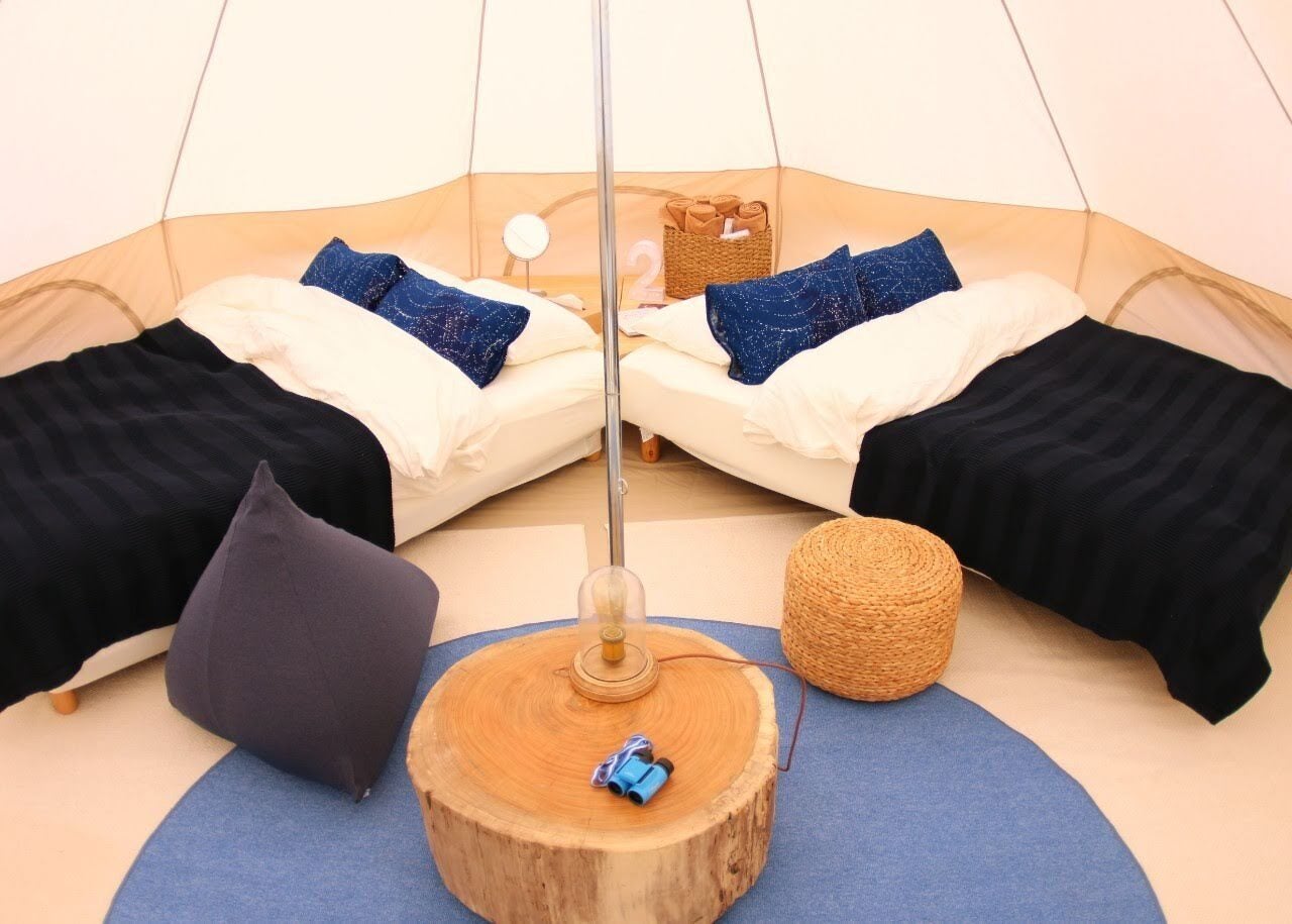 テント内には最大6人のベッドを準備予定。野外でも室内のように快適に滞在できる