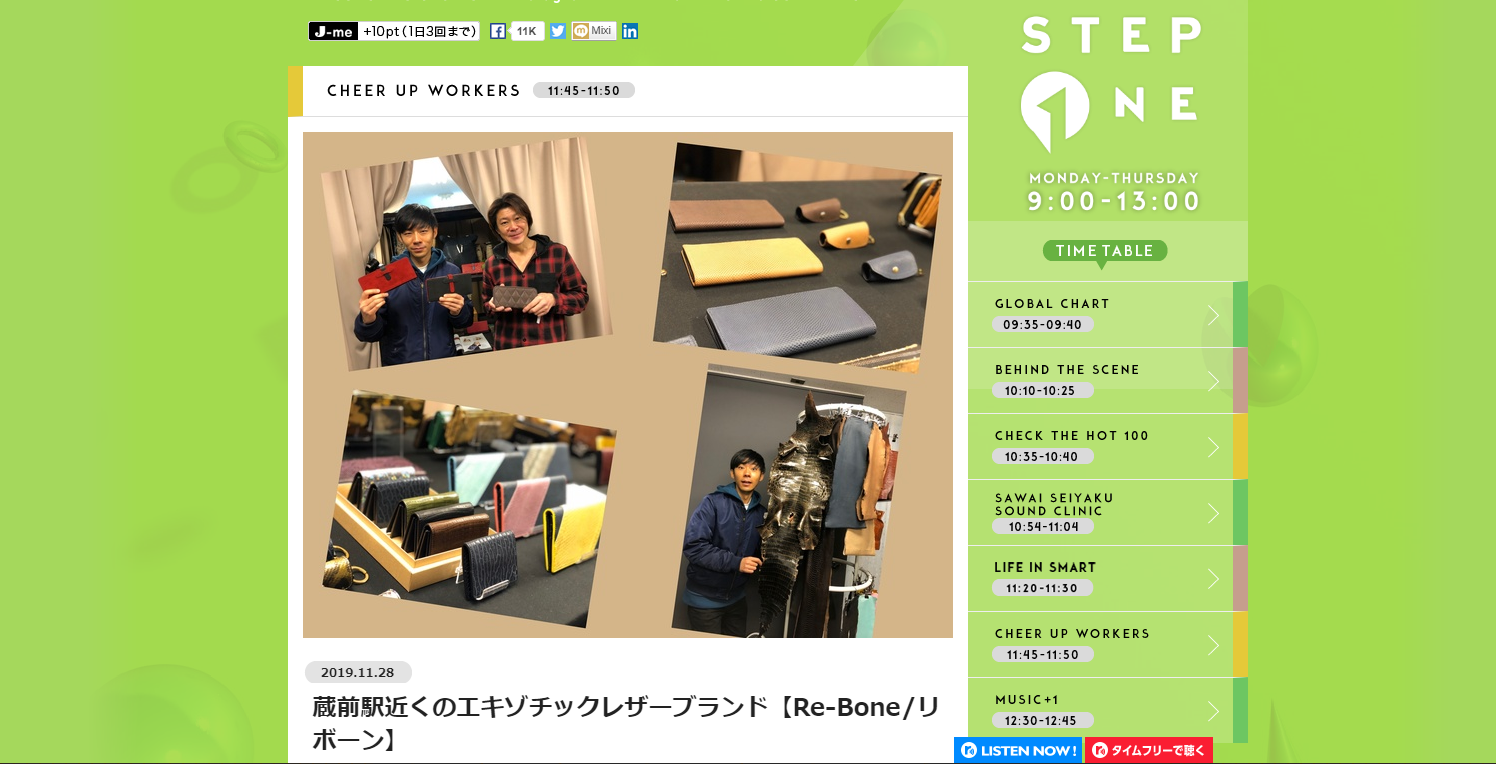 2019/11/28 21:45こんにちは、本日放送のJ-WAVE『STEP ONE』のコーナー「CHEER UP WORKERS」に出演させていただきました。けっこう緊張してしまいましたが、森本晋太郎さんのおかげで何とかPRすることが出来ました。下記のアドレスからお聴きいただけますと幸いです。https://www.j-wave.co.jp/original/stepone/workers/森本さん、サッシャさん、増井なぎささん、J-waveラジオ『STEP ONE』『CHEER UP WORKERS』スタッフの皆さま、有難う御座いましたm(_ _)m。 もっと見る