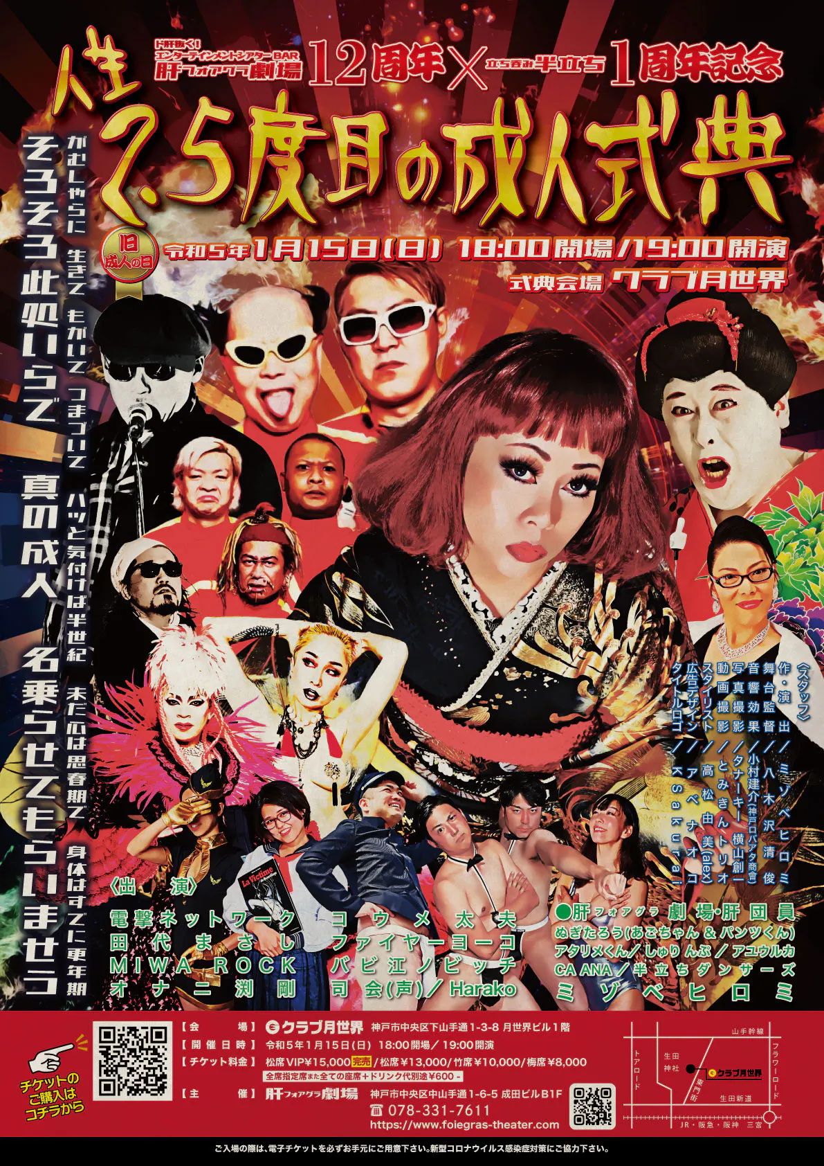 2022/12/26 23:33ド肝抜く成人式、開催決定です!真の成人に捧ぐ一大スペクタクルSHOW‼︎電撃ネットワーク・コウメ太夫・田代まさし他、豪華過ぎるゲスト陣と肝(フォアグラ)劇場が織り成す、驚愕の3時間です。老いも若きも、1月15日(旧成人の日)は月世界に集まれ!チケットご購入は、広告のQRコード・肝劇場ホームページ・または当方DMまでお気軽にお問合せくださいませ。こんなイベント、またとないよー♪肝(フォアグラ)劇場 12周年×立ち呑み 半立ち1周年記念『人生2.5度目の成人式典』◾︎会場クラブ月世界神戸市中央区下山手通1-3-8 月世界ビル1階◾︎開催日時令和5年1月15日(日) 18:00開場/19:00開演◾︎チケット料金(全席指定席)松席VIP ¥15,000 完売 ※お問い合わせ下さい。松席 ¥13,000竹席 ¥10,000梅席 ¥8,000*ドリンク代別途¥600▪︎CAST電撃ネットワークコウメ太夫田代まさしファイヤーヨーコMIWA ROCKバビ江ノビッチオナニ渕剛Harako/司会(声)~肝(フォアグラ)劇場・肝団員~ ぬぎたろう(あごちゃん&パンツくん)アタリメくんしゅり んぷアユウルカCA ANA半立ちダンサーズ ミゾベヒロミ▪︎STAF 作・演出:ミゾベヒロミ舞台監督:八木沢清俊音響効果:小村建介(神戸ロバアタ商會)写真撮影:タナーキー 横山創一動画撮影:とみきんトリオスタイリスト:高松由美(alex)広告デザイン:アベナオコタイトルロゴ:KSakurai◾︎主催肝(フォアグラ)劇場神戸市中央区中山手通1-6-5 成田ビルB1F☎︎078-331-7611https://www.foiegras-theater.com◉ご入場の際は、必ず電子チケットをお手元にご用意下さい。◉新型コロナウイルス感染症対策にご協力下さい。 もっと見る