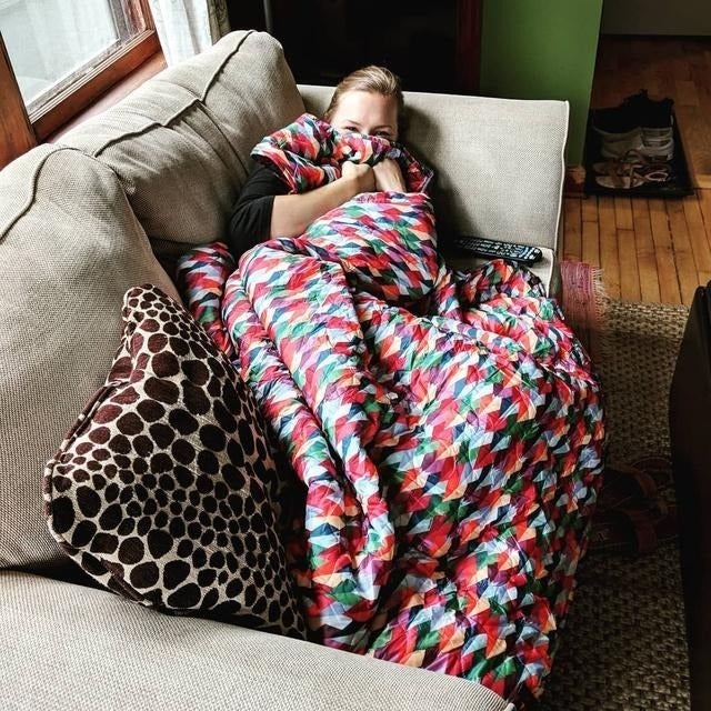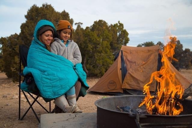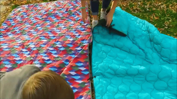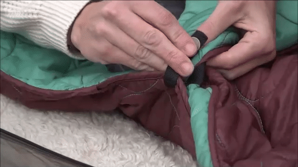1枚を縦に折り畳んでスナップで留めると寝袋に早変わり! 極寒でなければ十分かもしれません。もう大きな寝袋を持っていかなくてもいいかもしれませんよ?