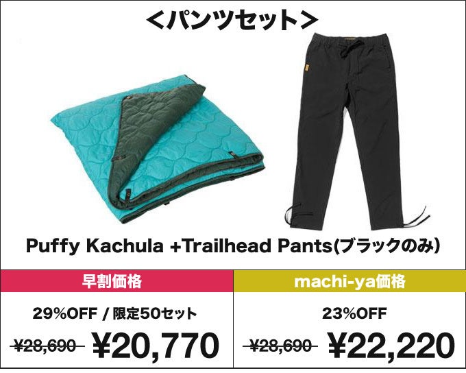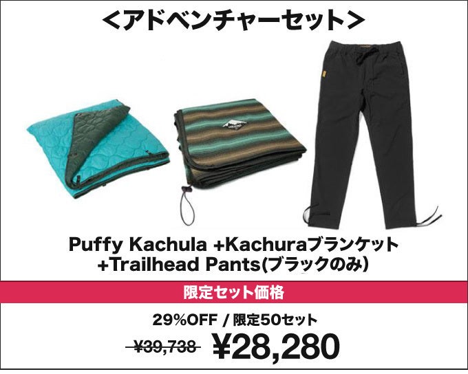 Puffy Kachulaとの組み合わせとして相性の良い「Kachula 2.0」と「TrailHead Pants」を揃えていただければみなさんのアウトドアライフが更に快適になること間違いなし!