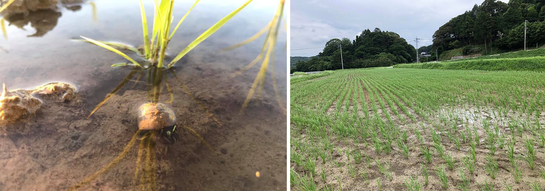 左写真はジャンボタニシ。タニシの口元に稗(ヒエ)の葉が見えます。稲の茎より柔らかいのでこちらから食べますが近くに何もなければ仕方なく稲も食べます。水を落とすタイミングには少し慣れが必要です。