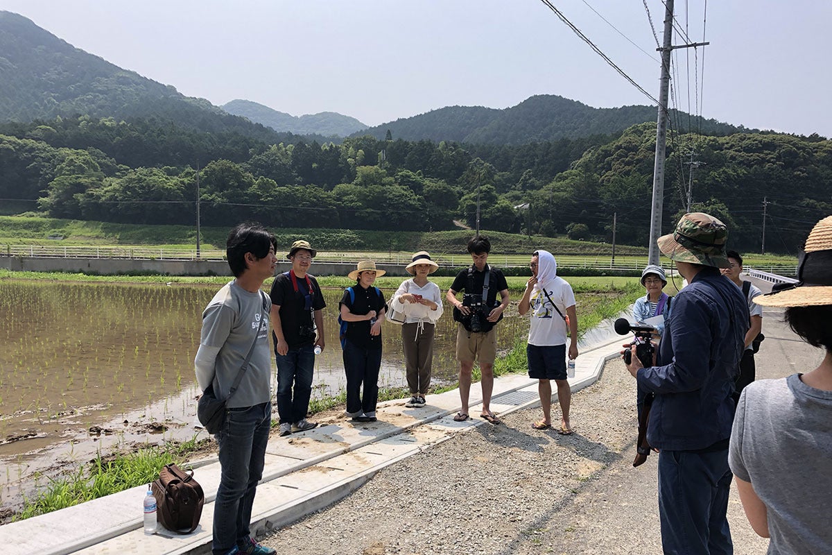 田植え見学会にて、福島が参加者の皆さんに農薬・化学肥料不使用の栽培がなぜ可能なのか説明。