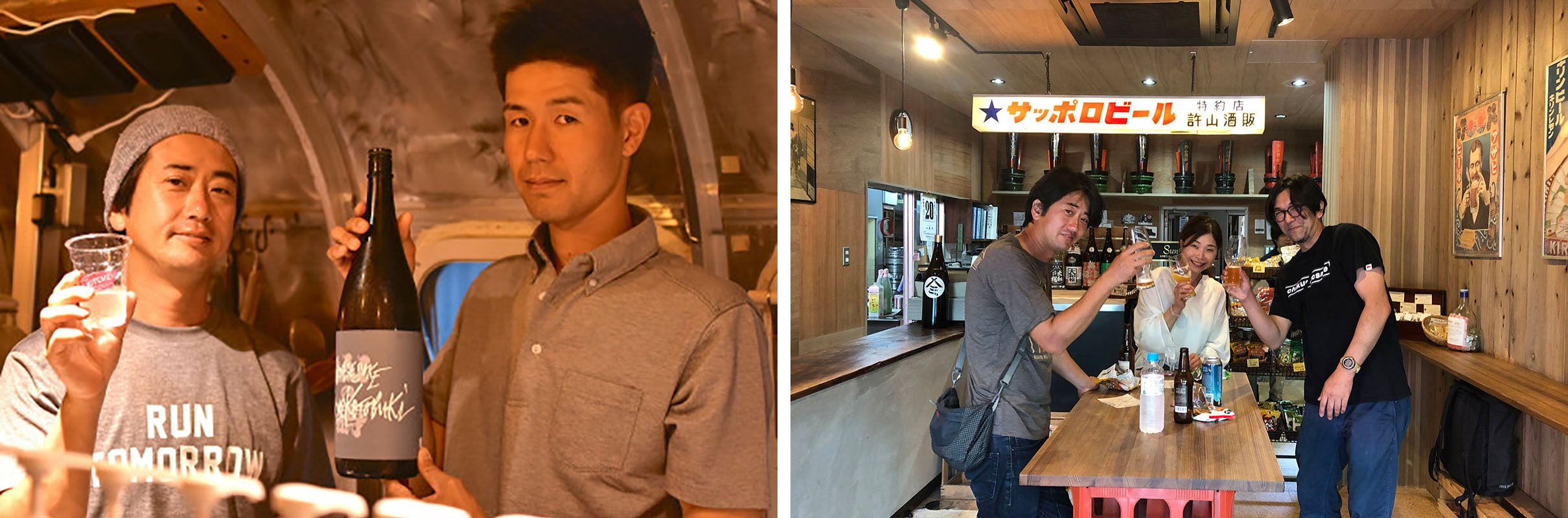 左写真:地元イベントでお酒をPR。右側が福島。左側が石松。右写真:日本酒プロジェクトのお酒を販売してくれている古賀市の許山酒販さんの角打ちにて。右側が斉田。中央が光瀬。