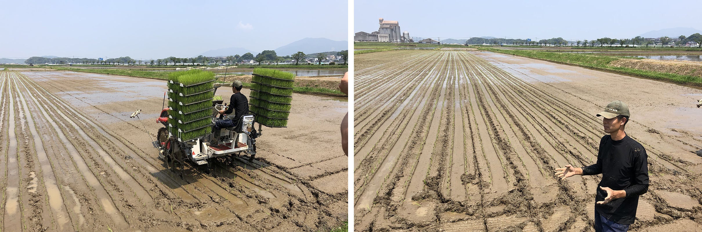 補足としてポット苗がなぜ良いと言われるのか。一般的には箱苗が使われます。その違いは苗の葉の数。箱苗では通常葉が3枚の幼い苗(稚苗)が使われます。箱苗の特徴は1枚の箱苗で多くの面積を植えることが出来ます。それに対してポット苗は葉が約5枚の大人の苗(中苗)が使われます。ポット苗は苗同士の隙間が大きいので、それぞれの苗の生命力を引き出すことが出来ます。ジャンボタニシは柔らかい草ほどよく食べる、という特徴があるので、若い草ほど食べられやすくなります。ポット苗はより固い、大人の苗で田植えするので、食べられにくくなる、という効果が得られます。