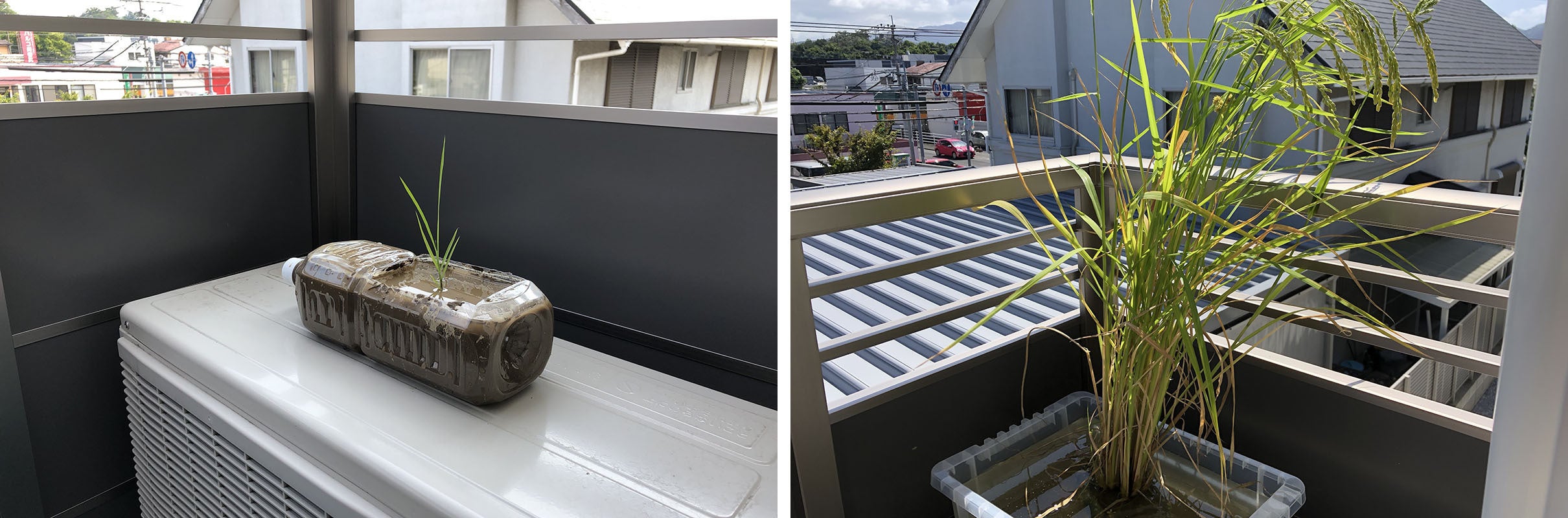 プロジェクトメンバーたちが自宅や仕事場で育てる。1つの苗から最終的には立派な稲になります。